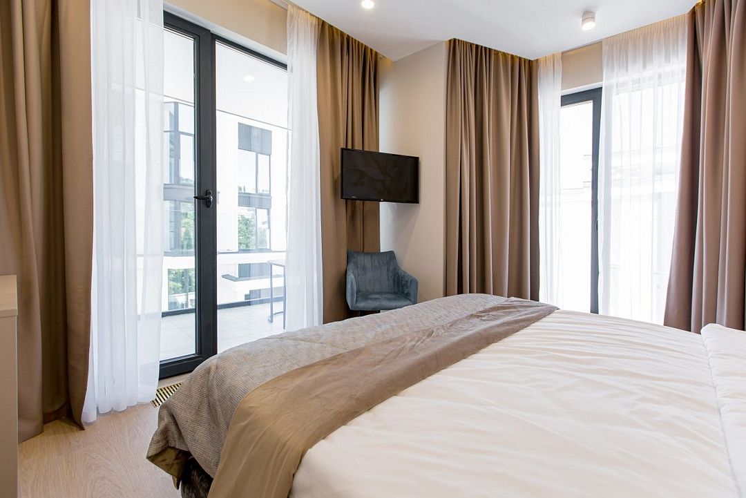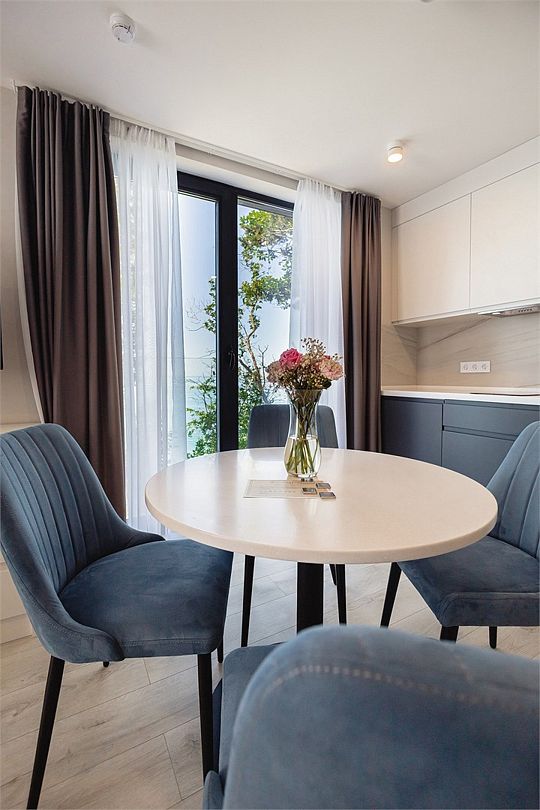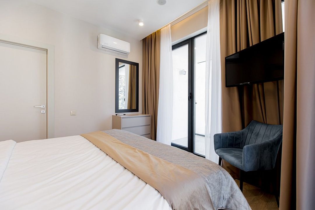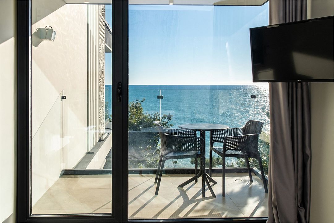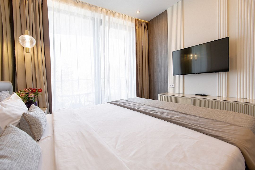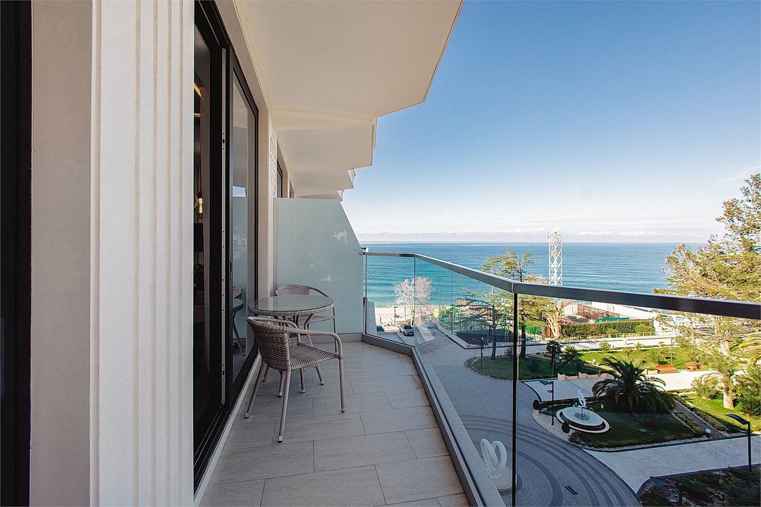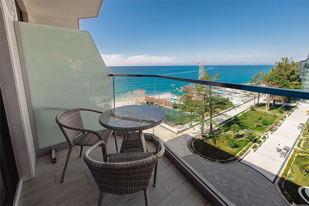 Стильные однокомнатные апартаменты площадью 21 м² отличаются современным и эргономичным дизайном. Панорамные окна и балкон с боковым видом на море создают неповторимую атмосферу, позволяя в полной мере насладиться отдыхом на побережье. Номера располагаются в главном корпусе на втором этаже и выше, а также в новом корпусе номер четыре.