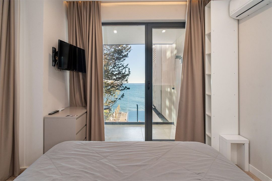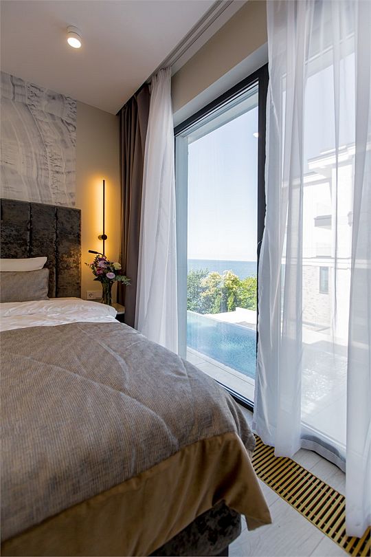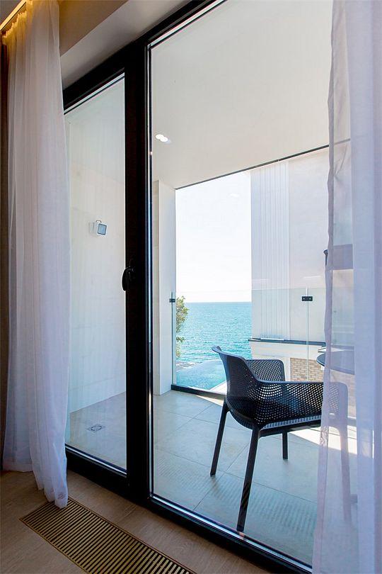 На втором этаже находится спальня с двуспальной кроватью, где вы сможете насладиться комфортным и спокойным сном. Отличительная черта данного номера — прямой вид на море с террасы номера и панорамное окно в спальне. К услугам гостей халаты, тапочки, пляжные полотенца, набор гигиенических принадлежностей, а также утюг и гладильная доска по запросу.