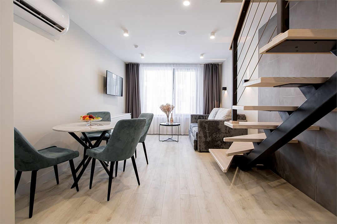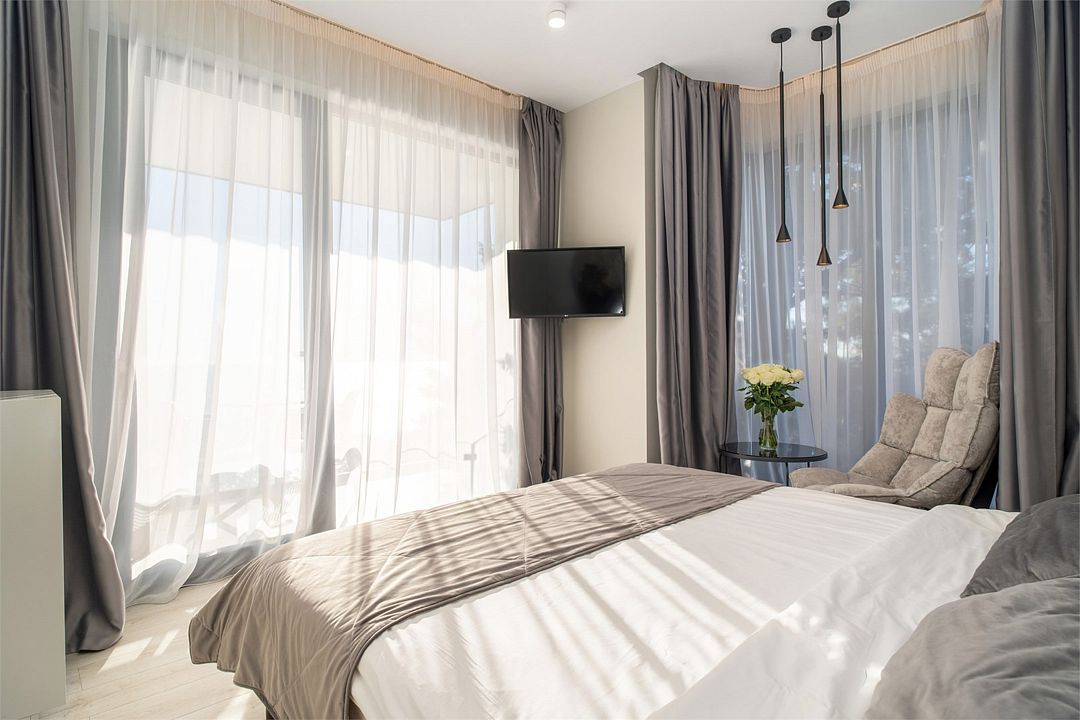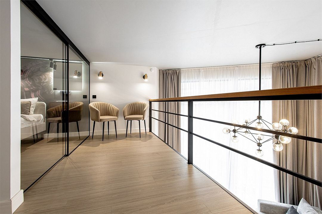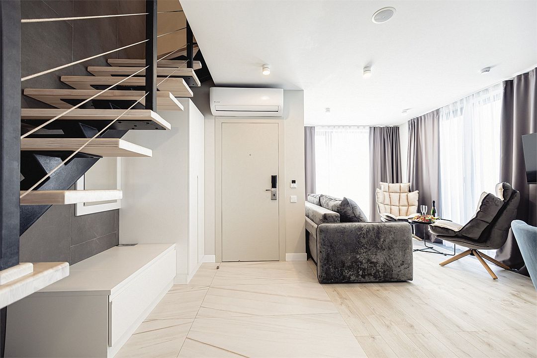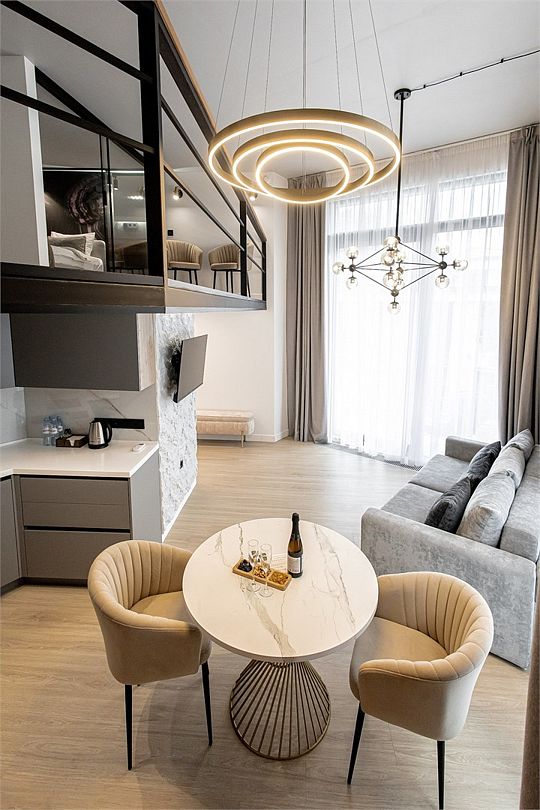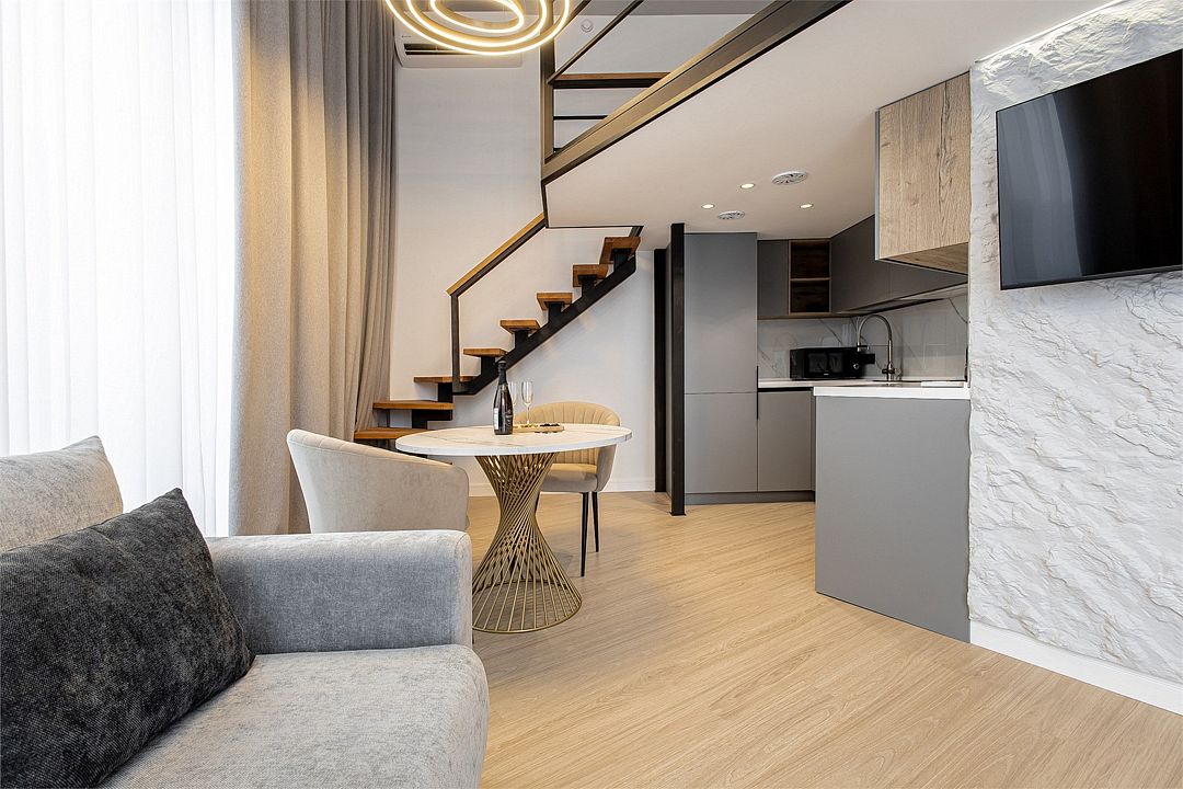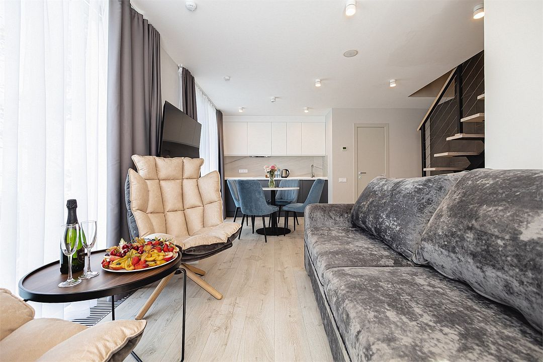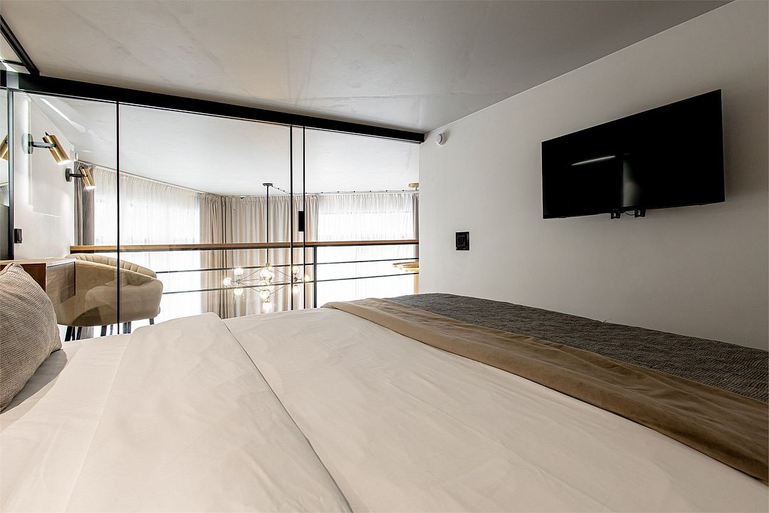 Двухэтажные стильные апартаменты категории Дуплекс джуниор идеально подходят для семейного размещения или отдыха повышенной комфортности. Панорамные окна и балкон, создают неповторимую атмосферу. Обратите внимание, высота потолков на втором этаже 190 см.