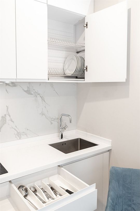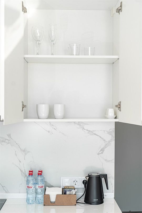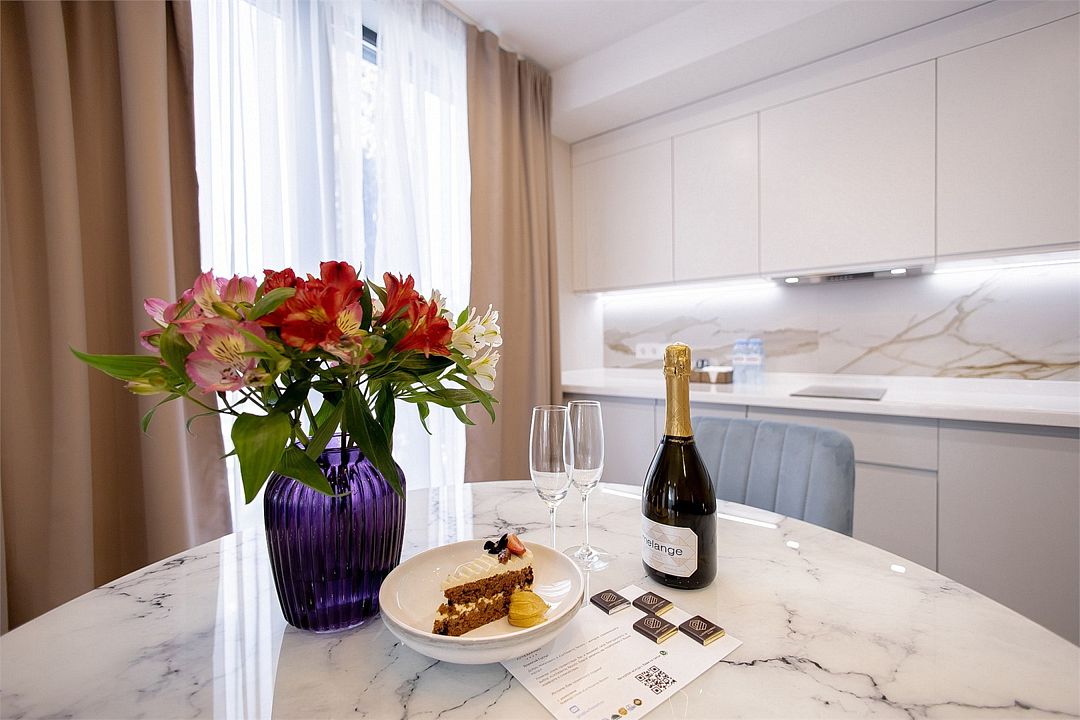 Апартаменты оборудованы мини-кухней, бытовой техникой, комплектом посуды, чайным набором. К услугам гостей халаты, тапочки, пляжные полотенца, набор гигиенических принадлежностей, а также утюг и гладильная доска по запросу.