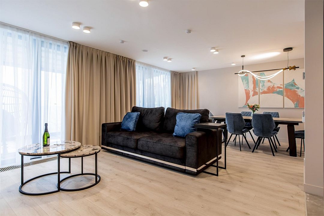 В номере есть все необходимое для комфортного проживания. Дополнительное спальное место в номере не предусмотрено. В номере две спальни с кроватями 160 см*200 см и гостиная с двухместным раскладным диваном. По запросу для детей до 3-х лет возможно предоставление детской кроватки.