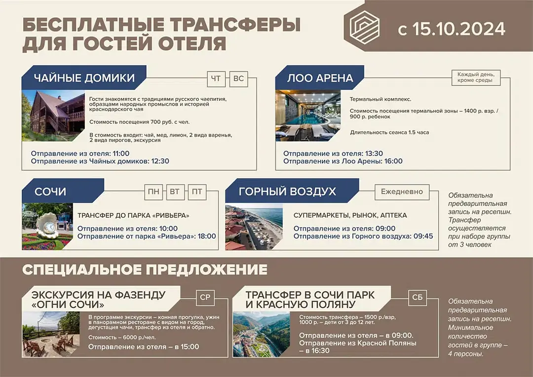 Время отправления трансфера: 13:30 Лучезарный - Лоо-Арена, 16:00 Лоо-Арена - ЛучезарныйТрансфер по расписанию