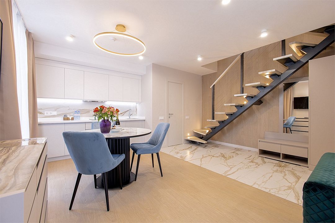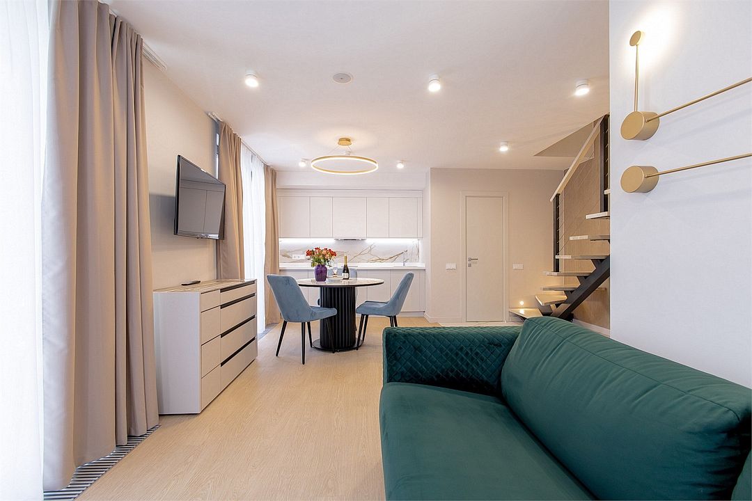 Дуплекс в новых корпусах отеля — номера площадью 50 м², которые идеально подходят для комфортного проживания семей или друзей. Номера состоят из двух уровней, где на первом этаже расположена гостиная зона с раскладным двухместным диваном, мини-кухней и обеденной зоной.