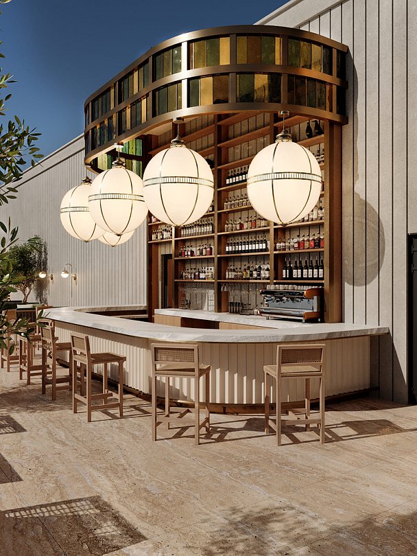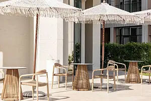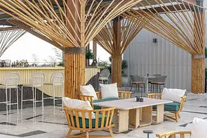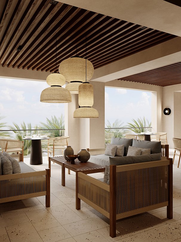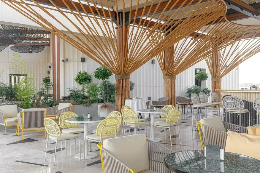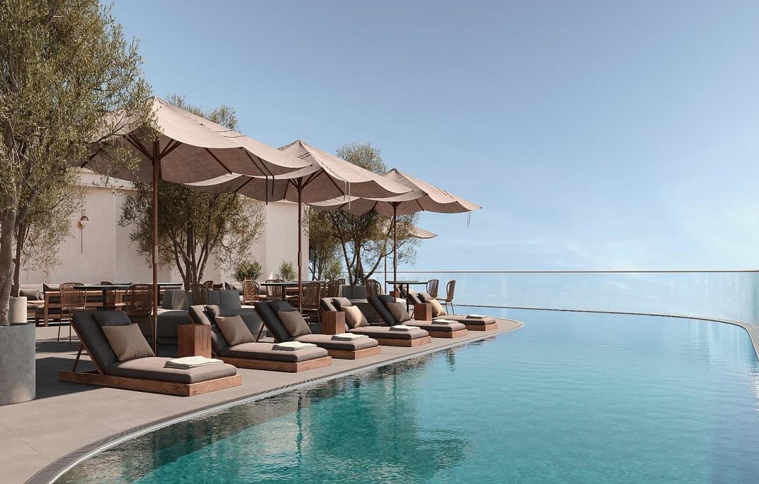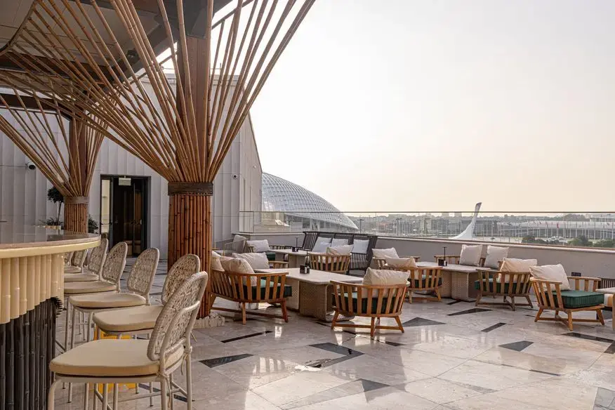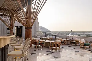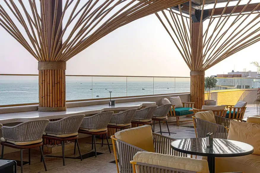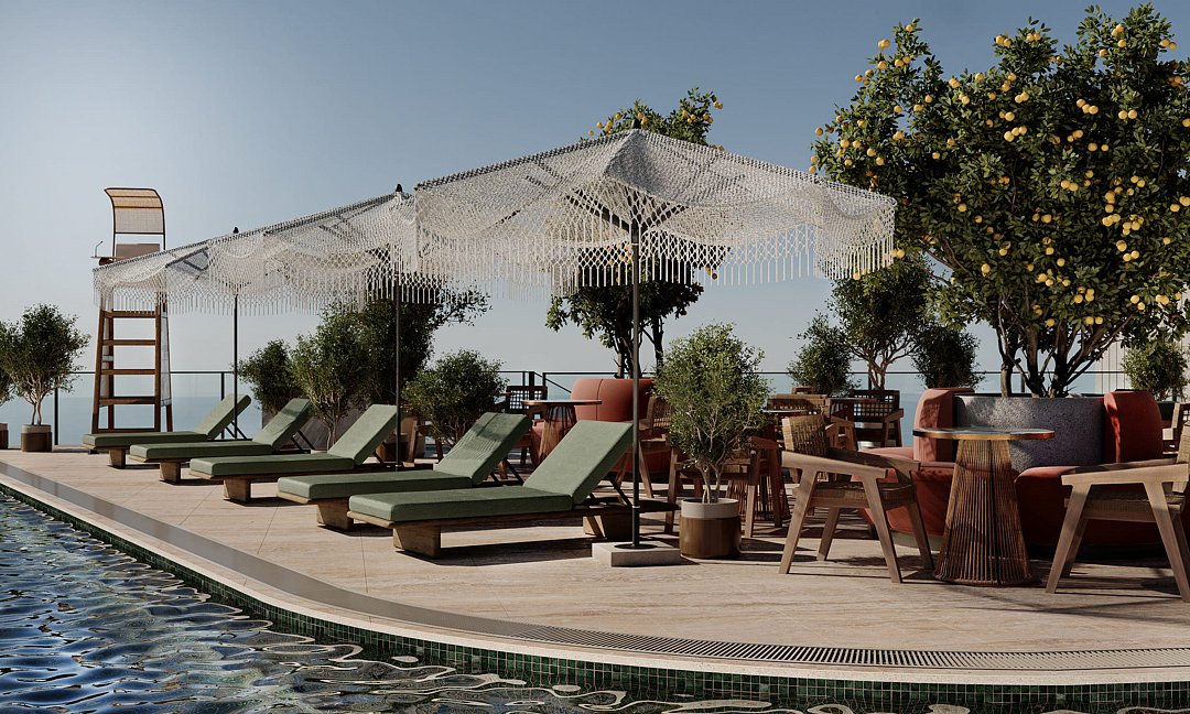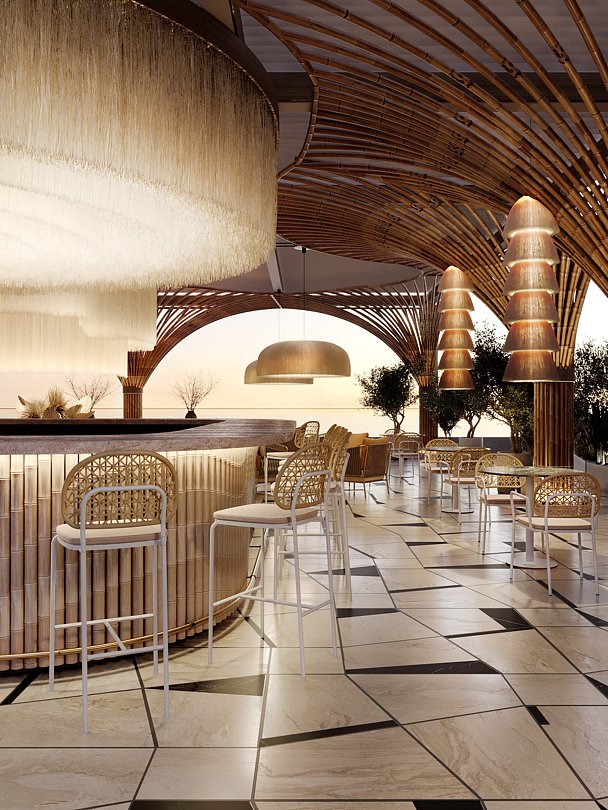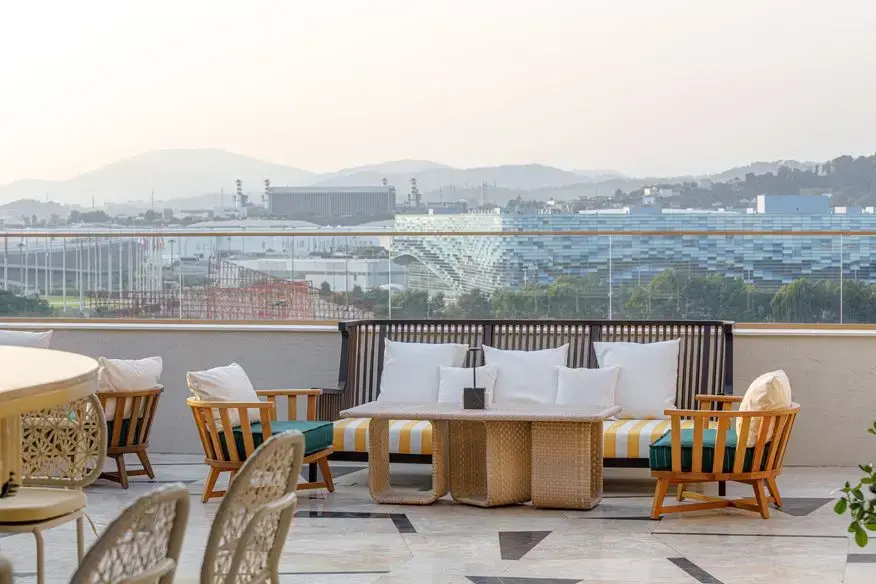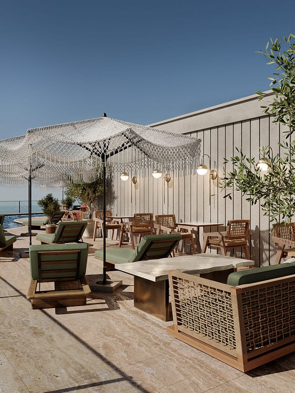 Летний бар под открытым небом на восьмом этаже отеля с завораживающим видом 360° на море и горы.