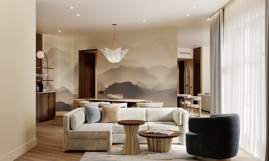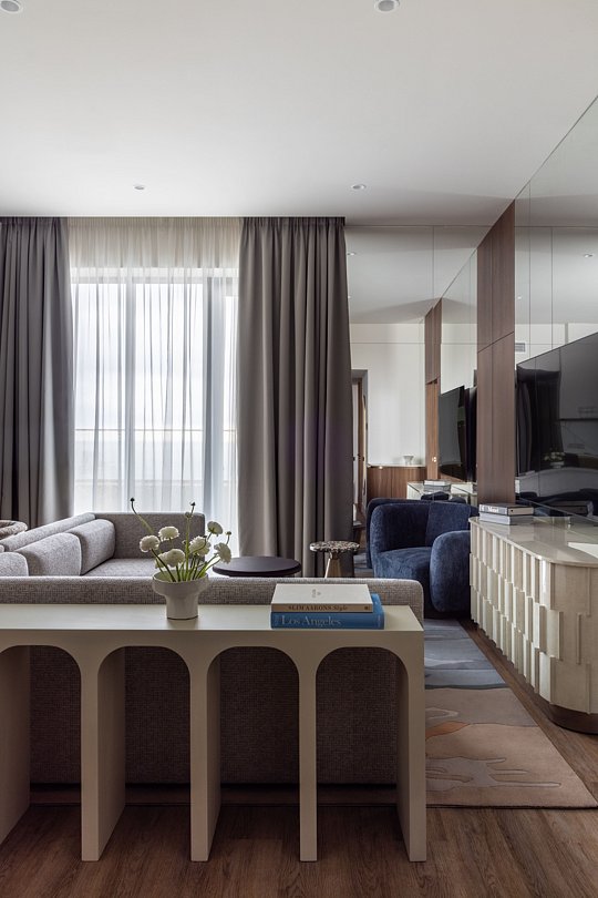 Особенностью номера является наличие гостиной, спальни, 2-х выходов на балкон и системы умный дом.