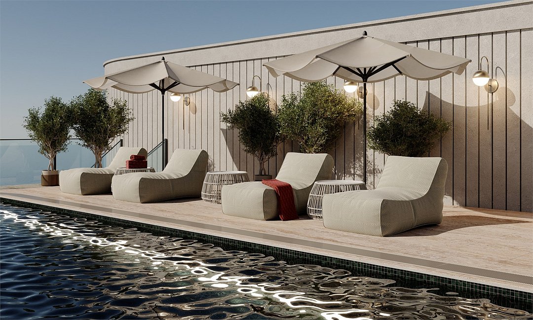 Особенностью номера является наличие меблированной террасы с видом на море площадью 30 м2 и системы умный дом.