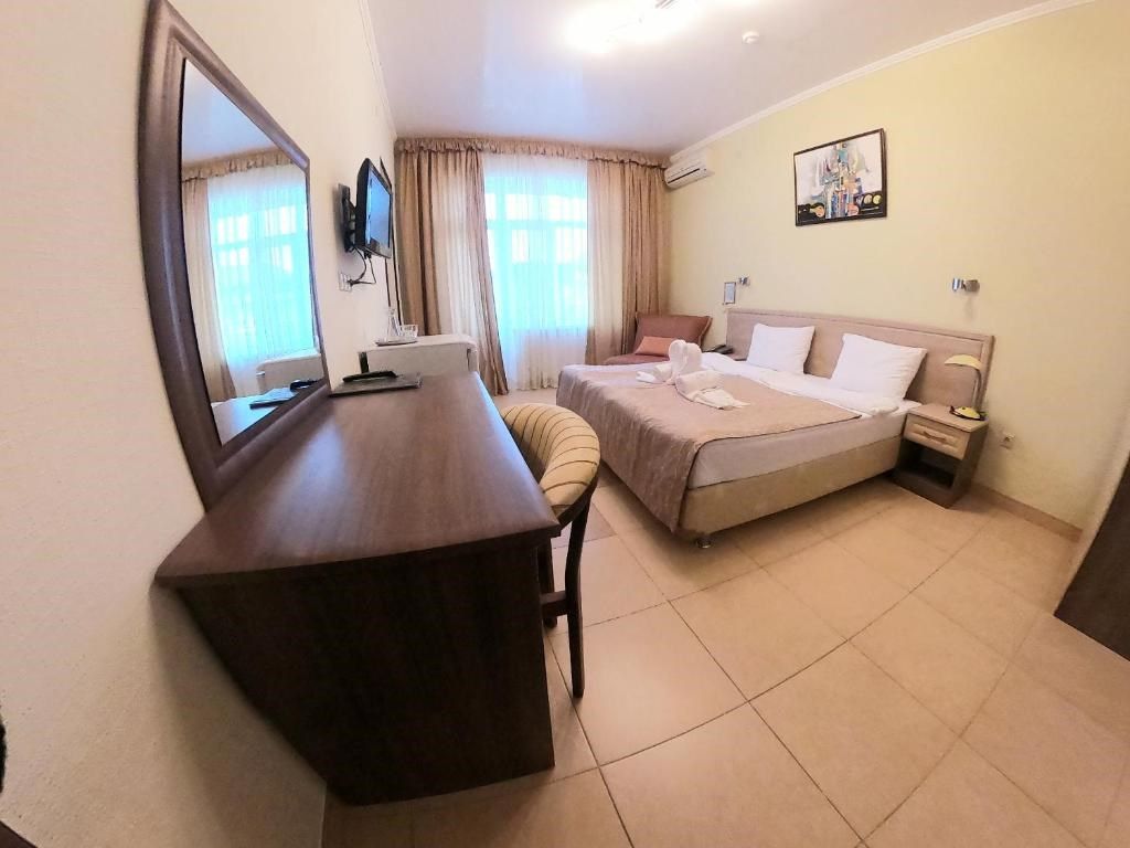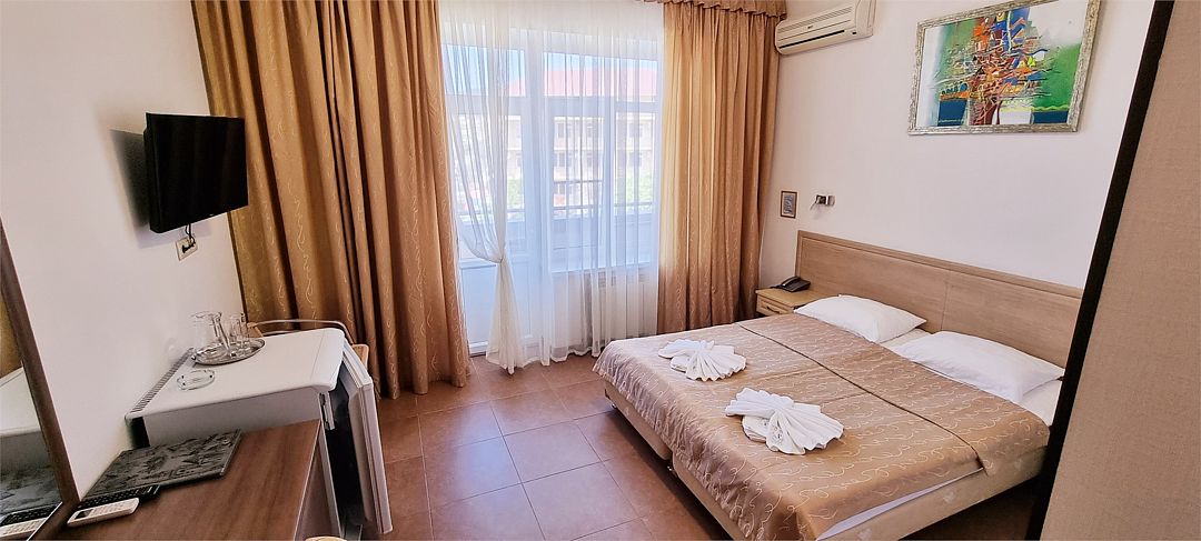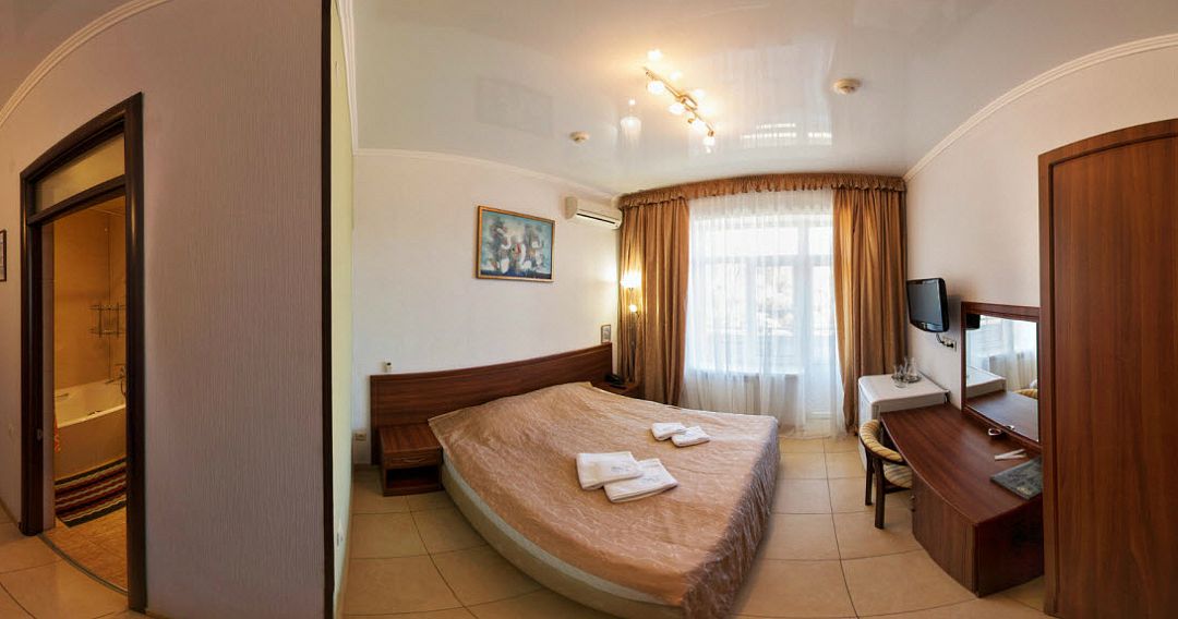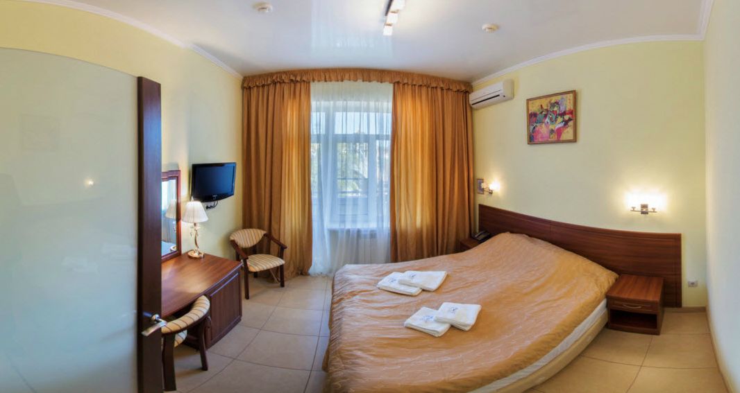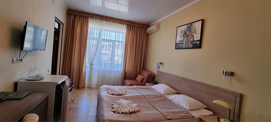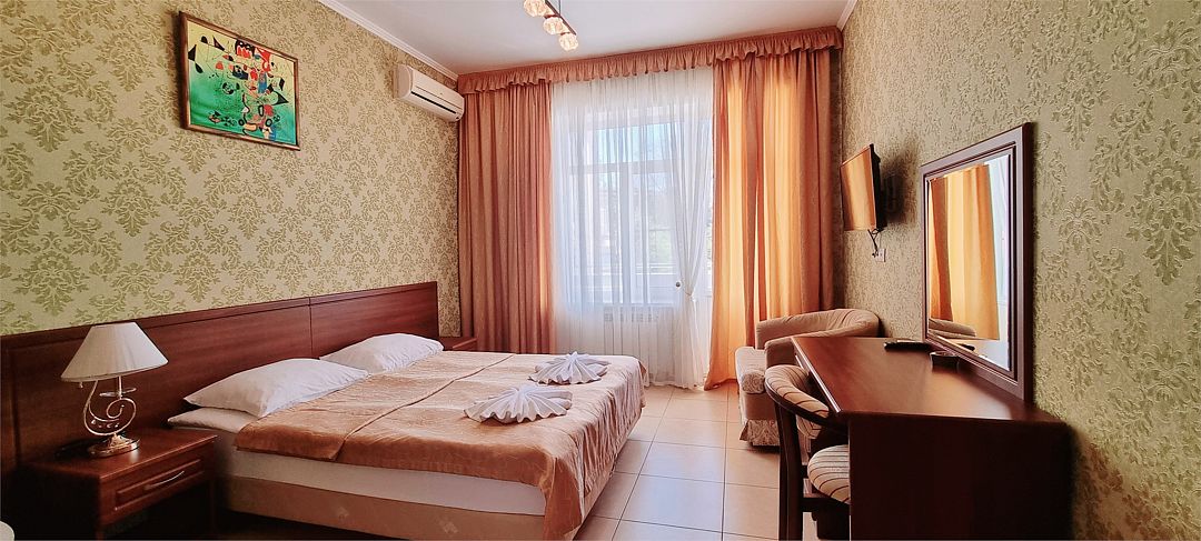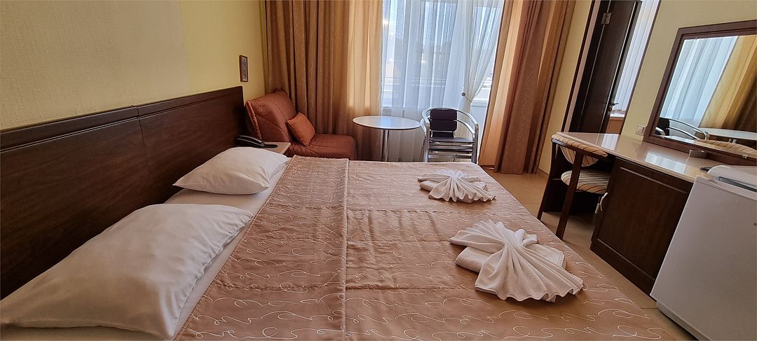 Комфортабельный номер с двухспальной кроватью или двумя раздельными. В номере: кондиционер,плазменный телевизор,балкон,туалет и душ,шкаф,тумбочки,фен.Услуги и удобства