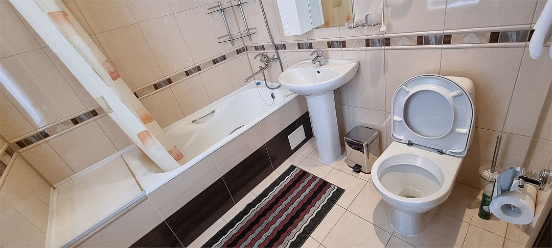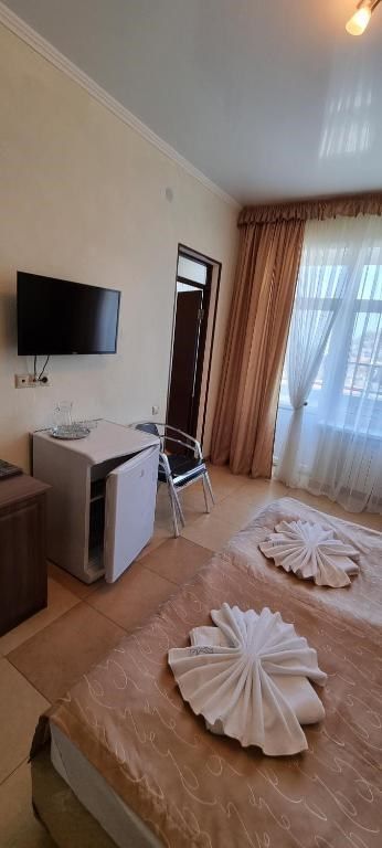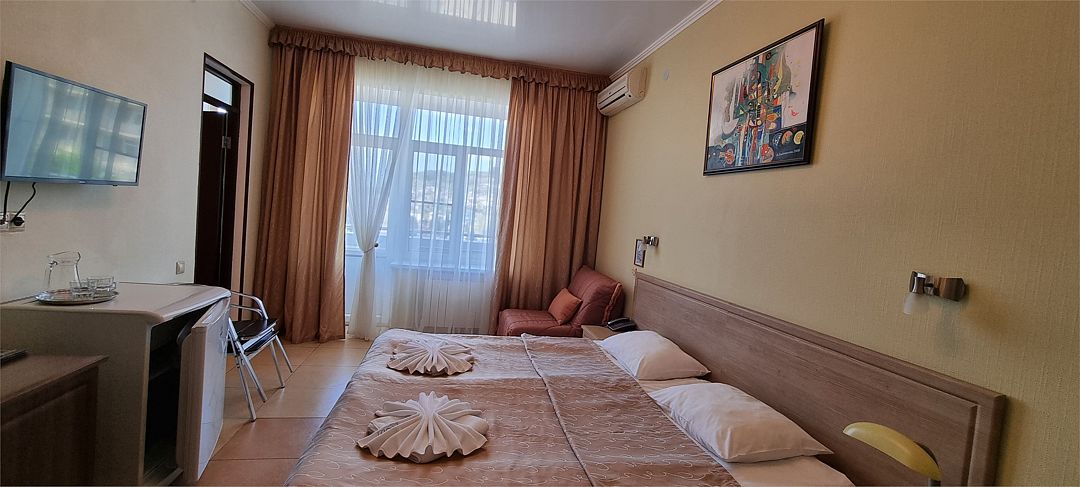 Комфортабельный номер с двухспальной кроватью и односпальной. В номере: кондиционер,плазменный телевизор,балкон,туалет и душ,шкаф,тумбочки,фен.Услуги и удобства