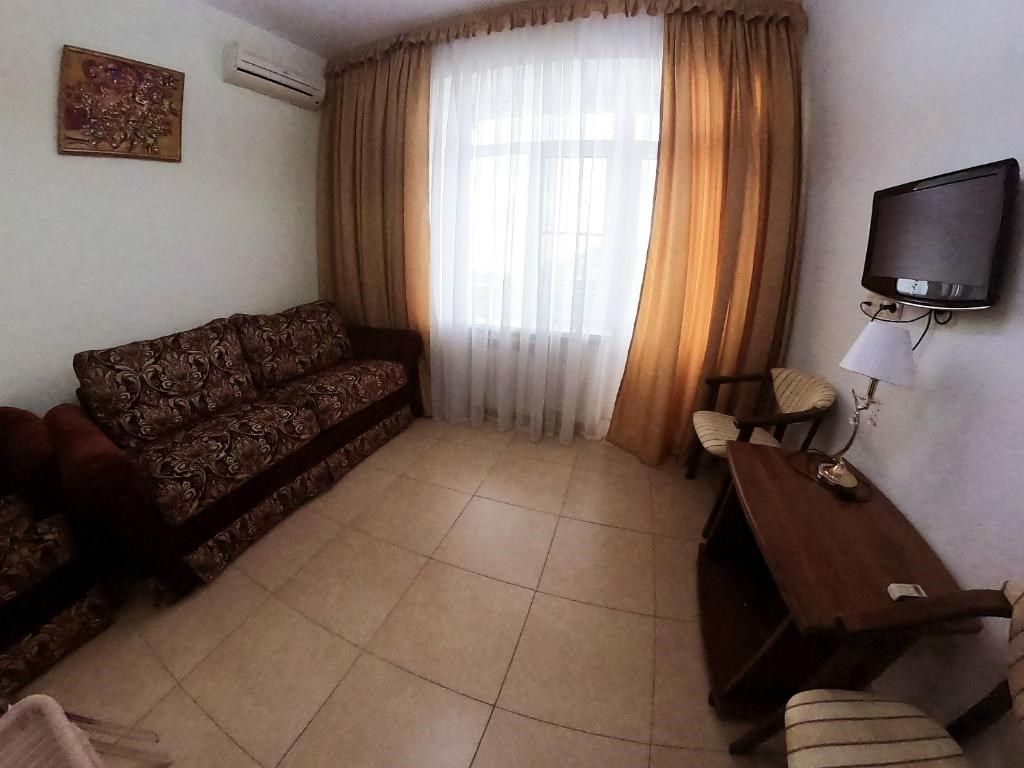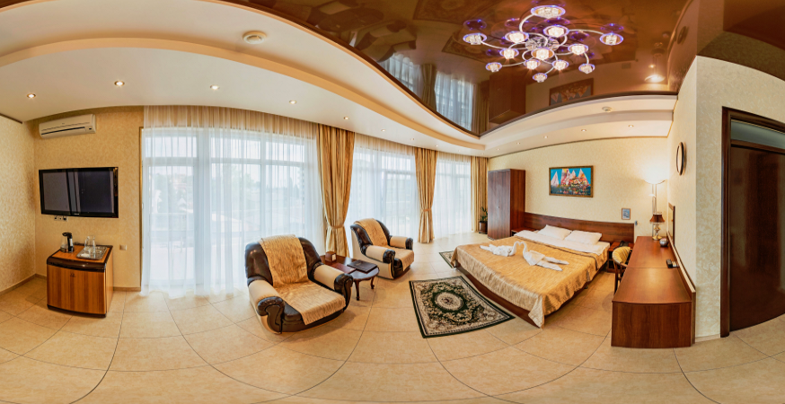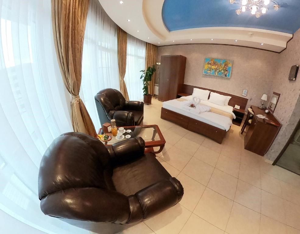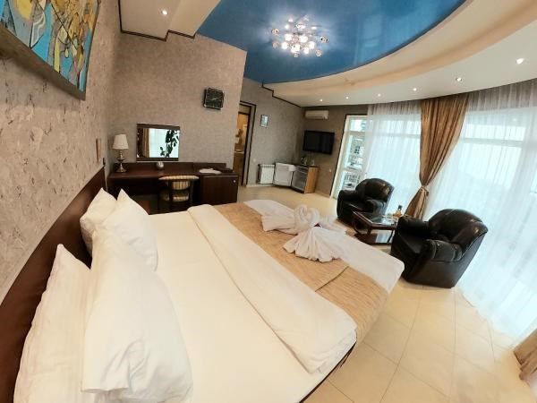 Комфортабельный номер с двухспальной кроватью и одной односпальной. Люкс с панорамным видом на море. В номере: кондиционер,плазменный телевизор,балкон,туалет и душ,шкаф,тумбочки,фен.Услуги и удобства