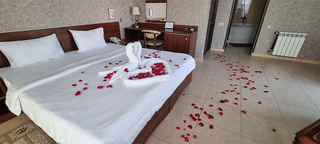 Комфортабельный двухкомнатный номер. В номере: кондиционер,плазменный телевизор,балкон,туалет и душ,шкаф,тумбочки,фен.Услуги и удобства