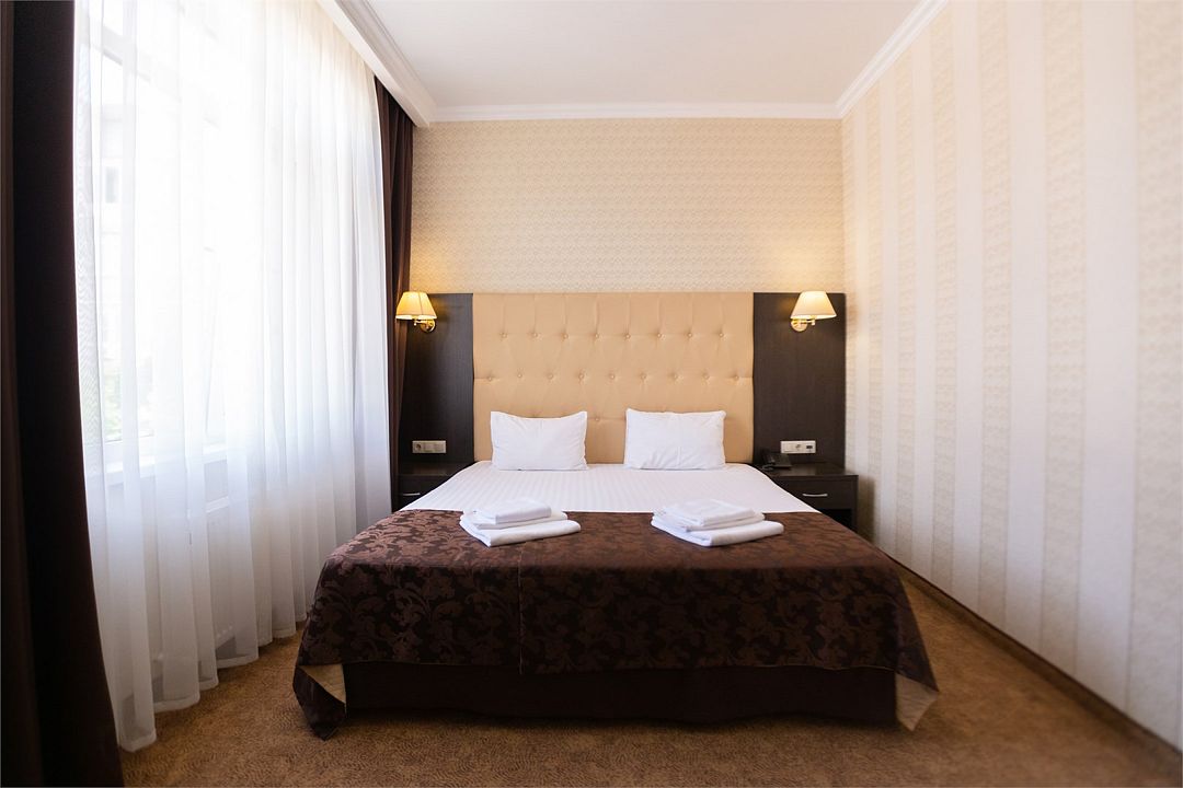 Номер сделан в европейском стиле и оснащен всеми современными удобствами для комфортного отдыха – кровать с ортопедическим матрасом, система климат контроля, зона отдыха, принадлежности для приготовления чая/кофе, сейф, холодильник, рабочее место с выходом в интернет. Двухкомнатный номер-люкс с кроватью King Size, диваном-кроватью и двумя плазменными телевизорами, рабочим столом.Услуги и удобства