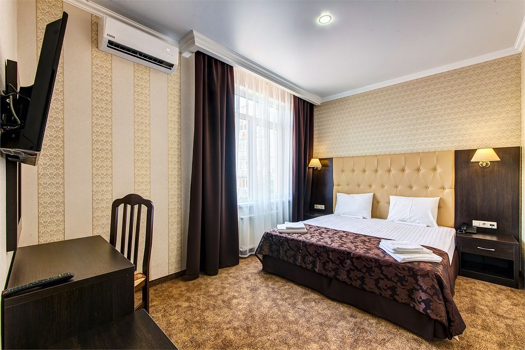 Wi-Fi, интернет, телефон, холодильник, кондиционер, светильник, настольные лампы, фен, будильник, система безопасности, электронные замки, радио, ванная комната, душевая кабина, санузел, банные принадлежности, банные полотенца, тапочки, гигиенические средства, косметические средства, кровать «King size», две полутораспальные кровати, тумбы, шкаф для одежды, вешалки, журнальный столик, письменный стол, зеркало, комод, сейф, унитаз, раковина, ковровое покрытие, отопление, душ, вид на город, вид во двор, стаканы, стул, туалетные средства, туалет, сплит-система, раскладное кресло, внутренний телефон, телевизор с плоским экраном, мини-холодильник, гостиничная парфюмерия, можно с питомцамиВ номере