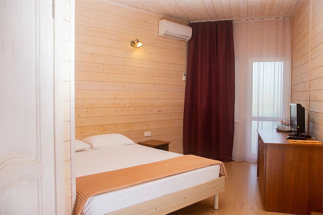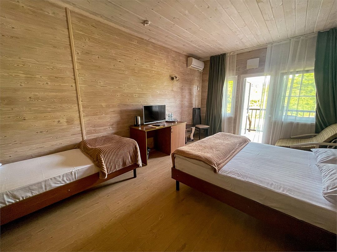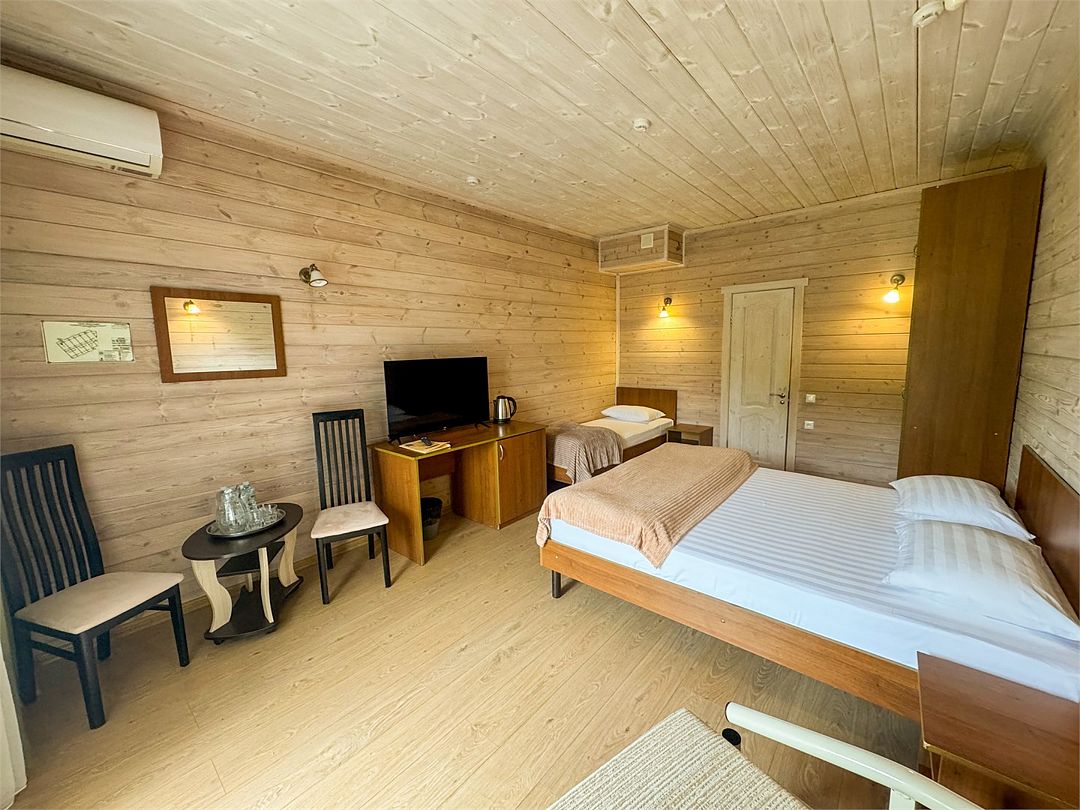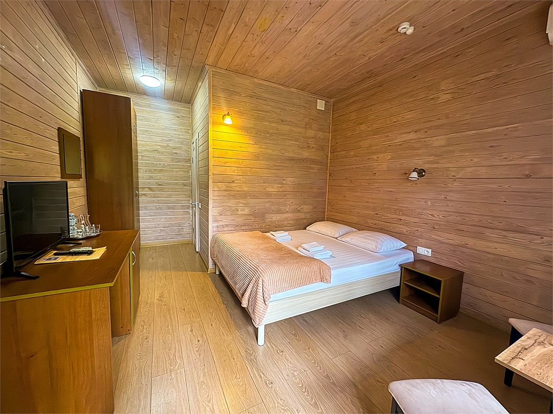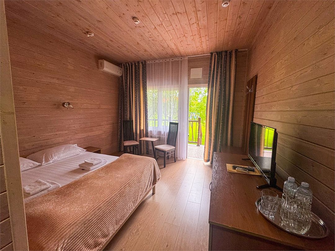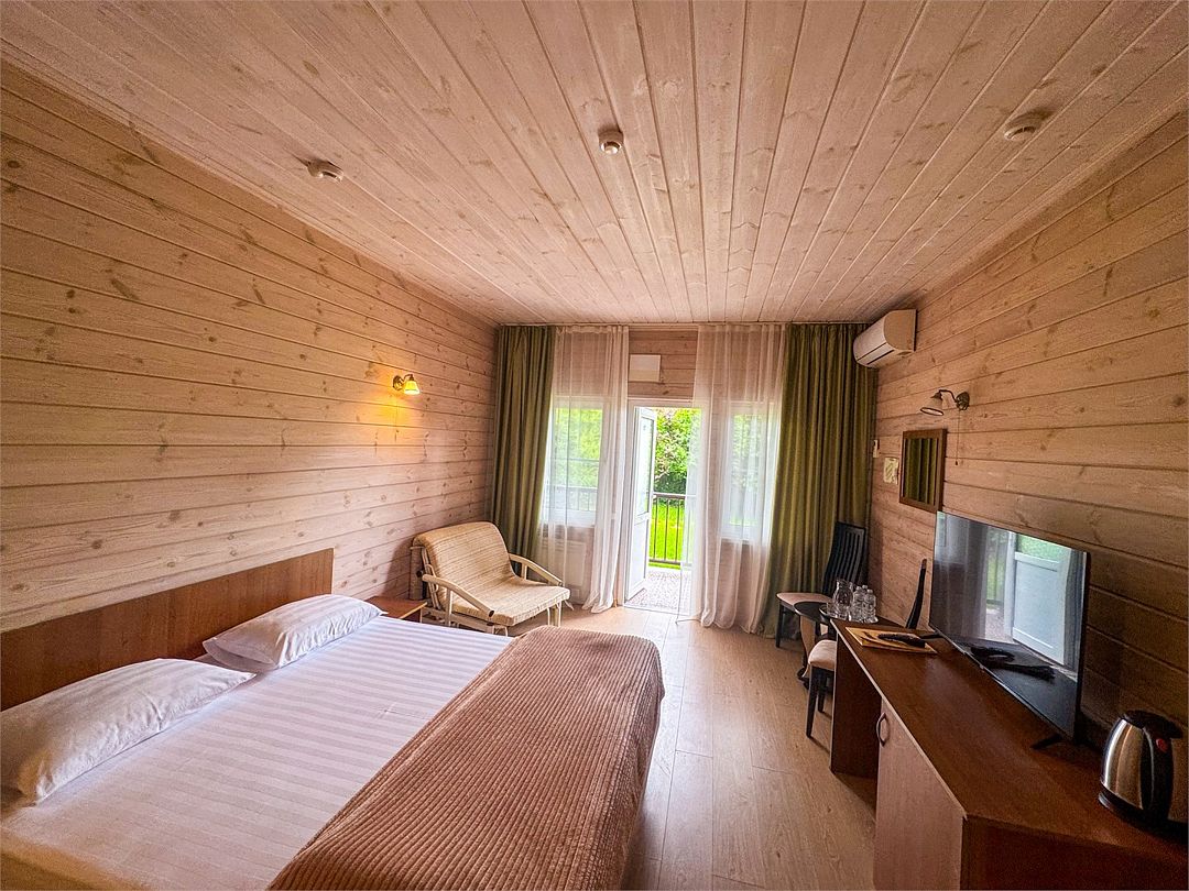 Уютные однокомнатные номера с двуспальной или двумя односпальными кроватями и возможностью установки дополнительного места для детей от 5 до 12 лет. Расположены в двухэтажном деревянном корпусе и оснащены террасой (на первом этаже) или балконом (на втором этаже).Услуги и удобства