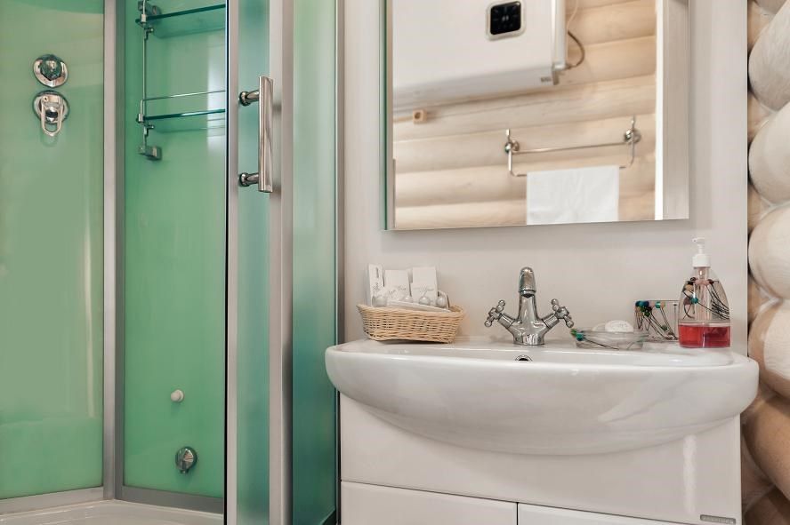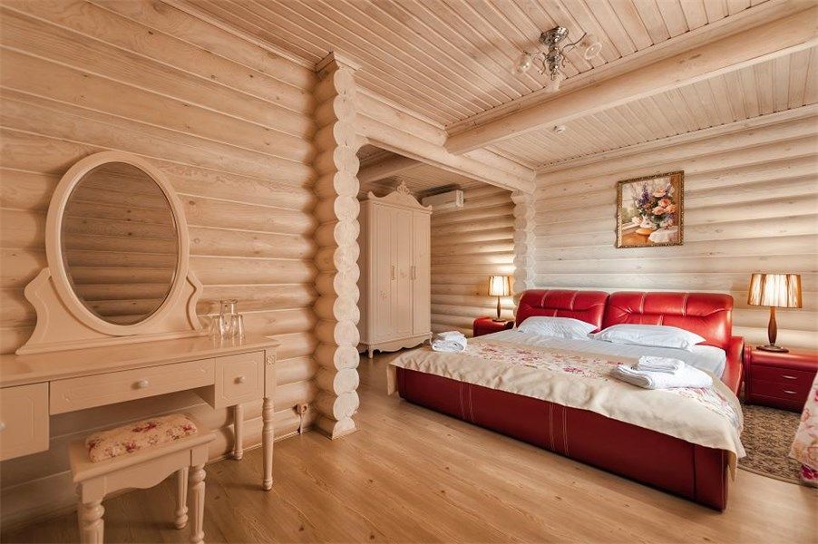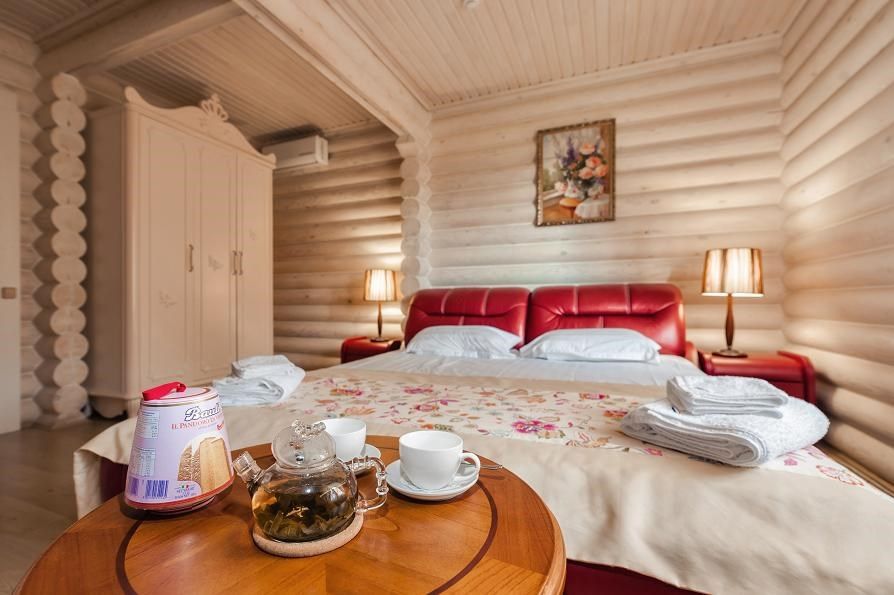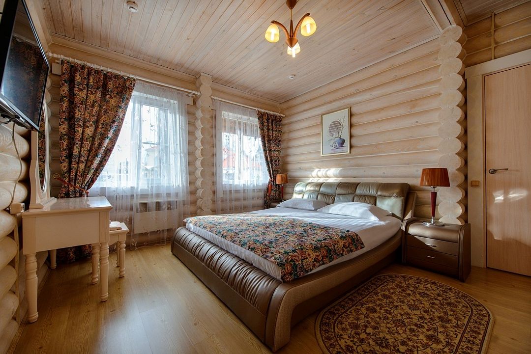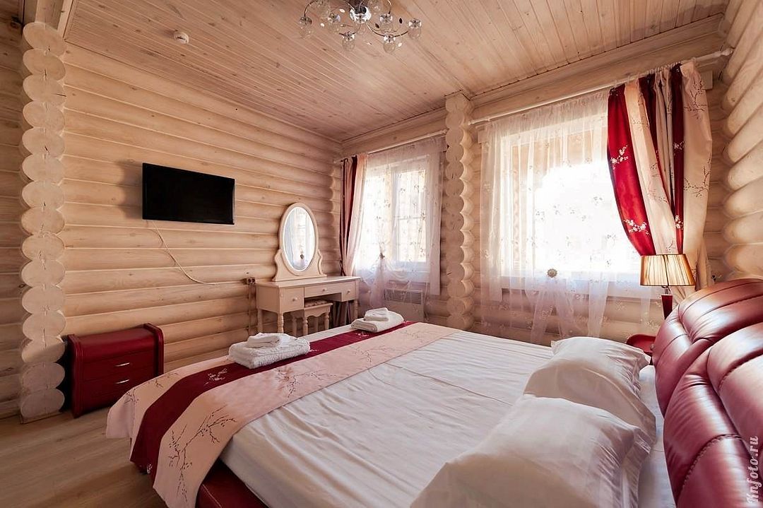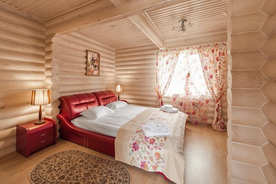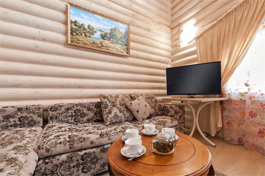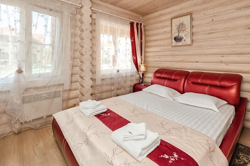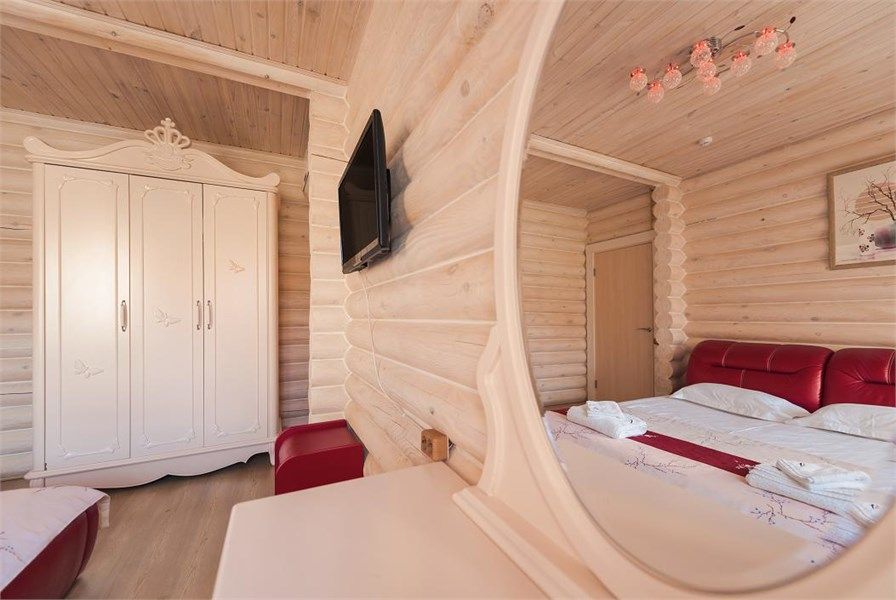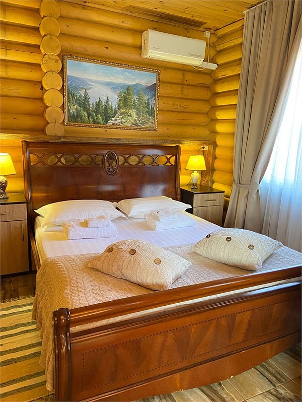Одноэтажный, отдельно стоящий эко-коттедж с собственной закрытой территорией, тремя спальнями (в которых одна двуспальная кровать, двуспальный диван и 2 раскладные кушетки) и гостиной (оснащена мини-кухней). Удобства: русская дровяная баня 4 часа в день, финская сауна 4 часа в день ,подогреваемая купель на улице (температура воды +36º/+38º), купель с холодной водой (внутри коттеджа), укомплектованная мини-кухня с УФ печью (без плиты), вместительный холодильник, телевизоры, фен, сейф, душ, кондиционеры, отдельная душевая кабина, утюг, гладильная доска, набор полотенец (банное, лицевое, пляжное, полотенце для ног), косметические принадлежности, собственная зона барбекю, большая гостиная с панорамным окном с видом на озеро, на террасе у купели - шезлонги, стол, стулья и большой купольный зонт.Услуги и удобства