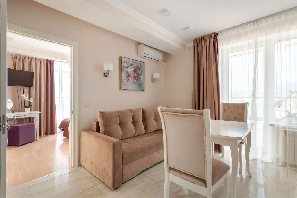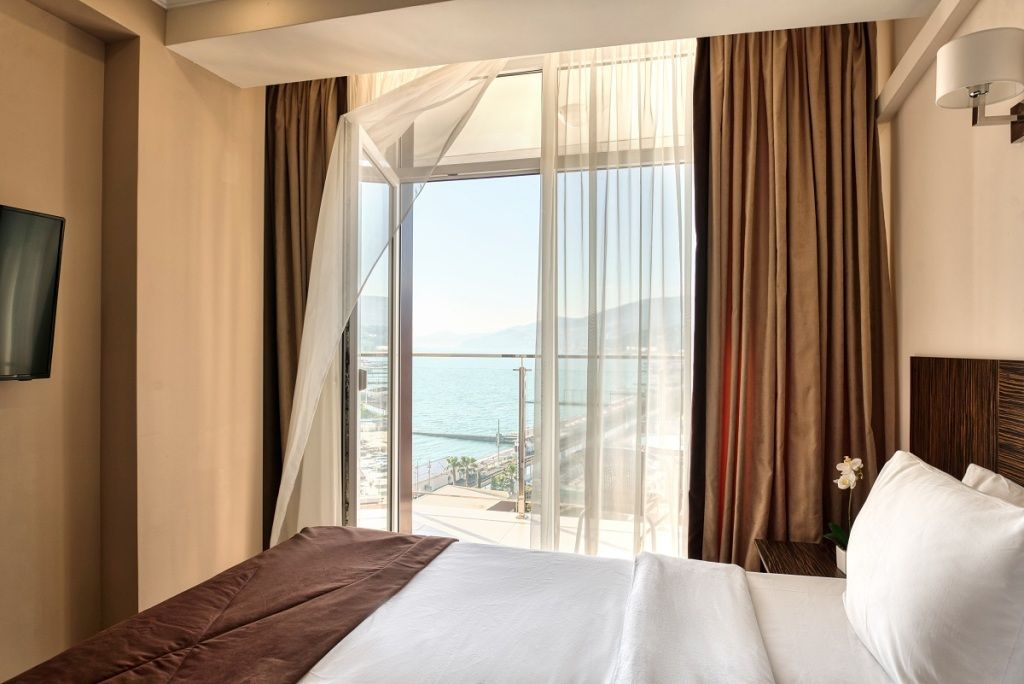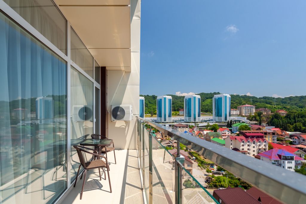 Уютный однокомнатный номер с балконом с прямым видом на море с возможностью размещения до 4х человек. Общая площадь номера – 37м2. Спальные места – двуспальная кровать, раскладной двуспальный диван. В номере полностью оборудованная кухня, необходимый набор посуды, ванная комната с ванной или душем, балкон. Номера данной категории располагаются с 6 по 11 этаж. При заселении с гостей взимается возвратный депозит - 5000 рублей. Питание по системе "Шведский стол" проходит в ресторане "Миндаль" (отдельно стоящее от жилых корпусов здание).Услуги и удобства
