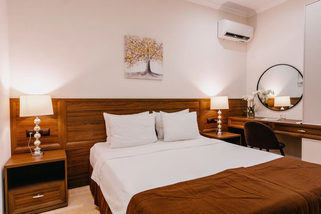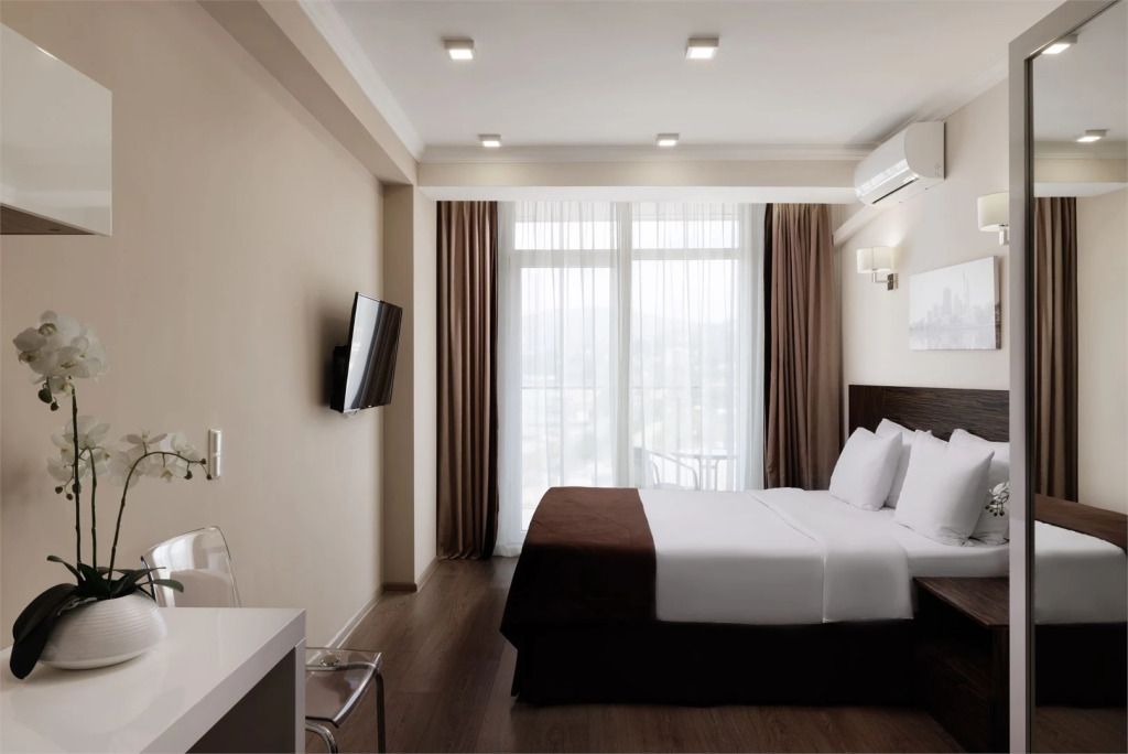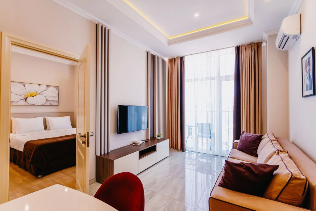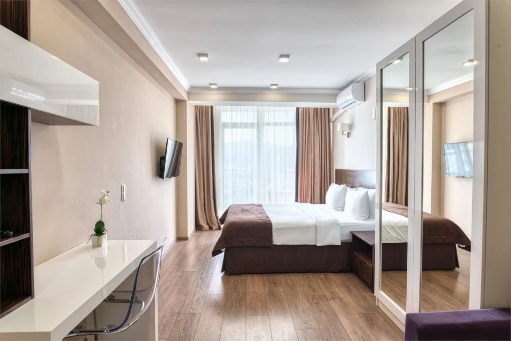 Апартаменты 2х-комнатные Люкс с кухней и балконом – просторный номер с выделенной спальней общей площадью 45 кв.м с возможностью размещения до четырех человек. Спальные места – двуспальная кровать, раскладной двуспальный диван. Номера данной категории располагаются со 2 по 5 этаж. При заселении с гостей взимается возвратный депозит - 5000 рублей. Питание по системе "Шведский стол" проходит в ресторане "Миндаль" (отдельно стоящее от жилых корпусов здание).Услуги и удобства