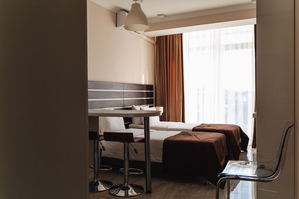 Просторный однокомнатный номер общей площадью 37 м2. с возможностью размещения четырех человек. Спальные места – две односпальные кровати, которые стоят вместе или могут быть раздвинуты, раскладной двуспальный диван. В номере полностью оборудованная кухня, необходимый набор посуды, ванная комната с ванной или душем, балкон с видом на море. Номера располагаются с шестого по одиннадцатый этаж. При заселении с гостей взимается возвратный депозит - 5000 рублей. Питание по системе "Шведский стол" проходит в ресторане "Миндаль" (отдельно стоящее от жилых корпусов здание).Услуги и удобства