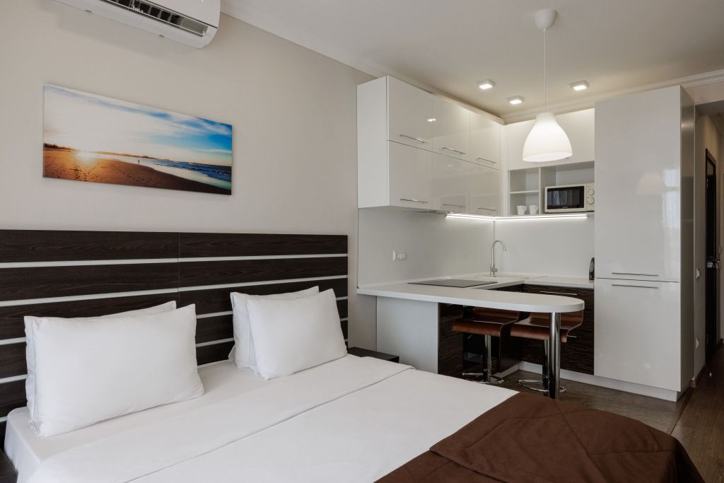 Комфортный однокомнатный номер общей площадью 24м2. с возможностью размещения двух человек. В номере полностью оборудованная кухня, необходимый набор посуды, ванная комната с ванной или душем, балкон с видом на море. Номера располагаются с шестого по одиннадцатый этаж. Спальное место - две односпальные/одна двуспальная кровать. При заселении с гостей взимается возвратный депозит - 5000 рублей. Питание по системе "Шведский стол" проходит в ресторане "Миндаль" (отдельно стоящее от жилых корпусов здание).Услуги и удобства
