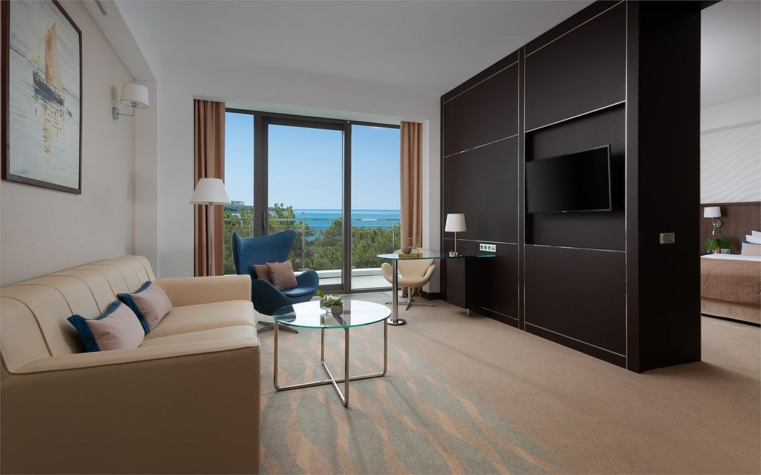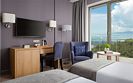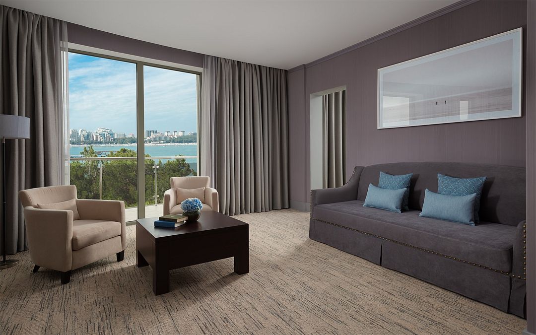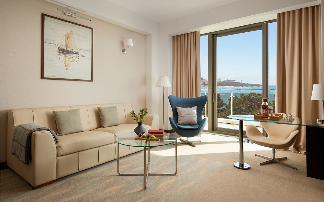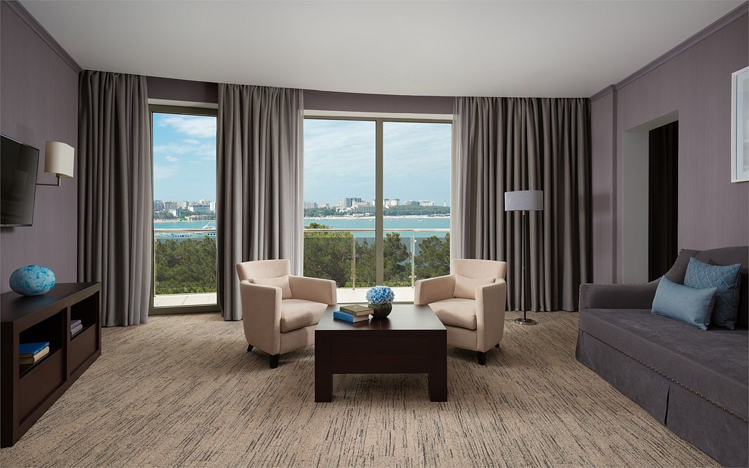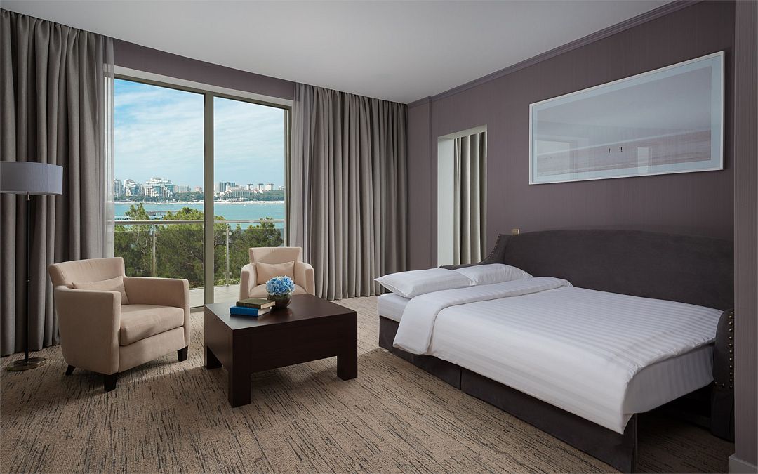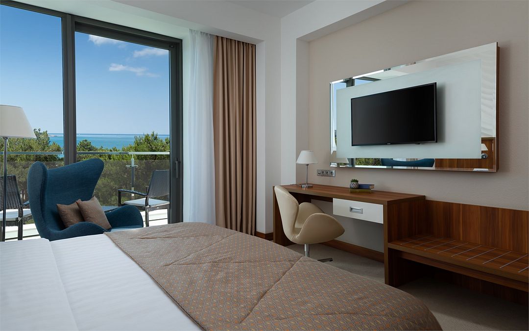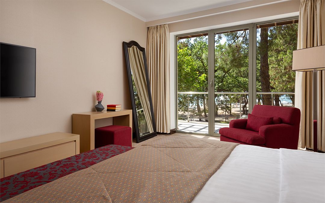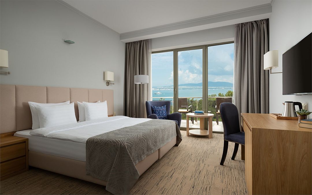 спутниковое телевидение, Wi-Fi, телефон, кондиционер, фен, ванна, санузел, халаты, банные полотенца, тапочки, гигиенические средства, косметические средства, балкон, две односпальные или большая двуспальная кровать, кресла, тумбы, вешалки, письменный стол, пуфики, мини-бар, чайный набор, сейф, косметическое зеркало, питьевая вода, ковровое покрытие, отопление, вид на море, кресло, стаканы, столовые приборы, стол, туалетные средства, телевизор с плоским экраном, шкаф-купе, можно с питомцами, игрушки, миска, пакетик для выгулаВ гостиничном номере