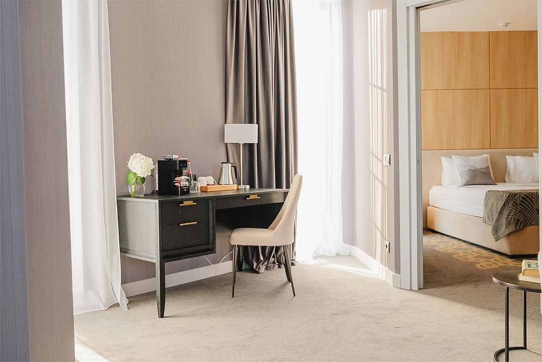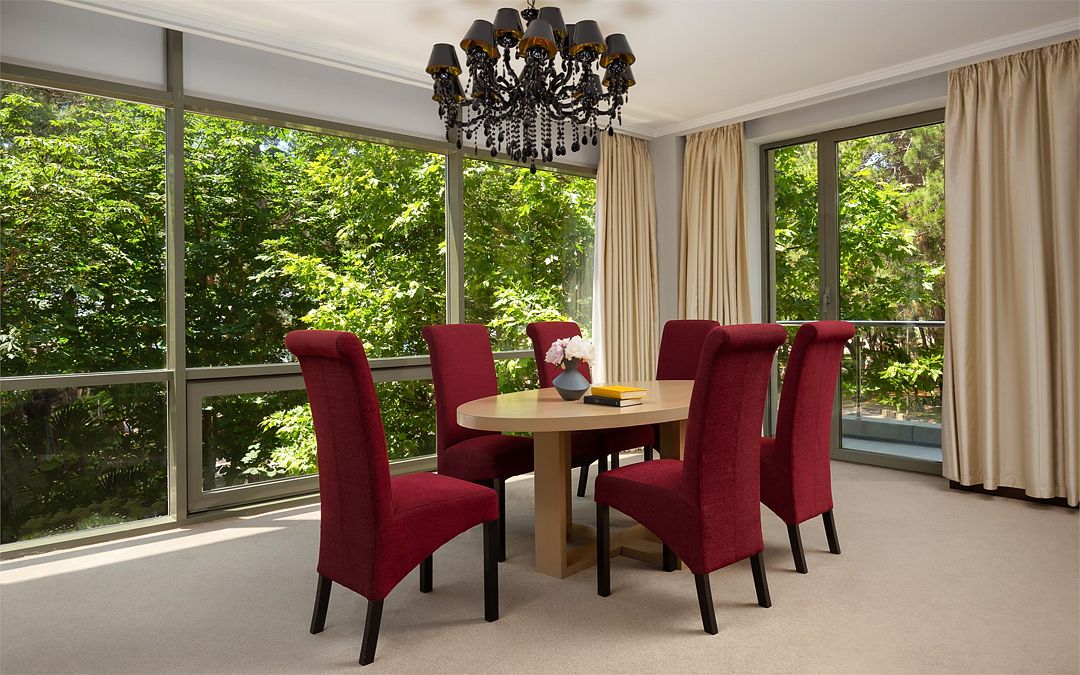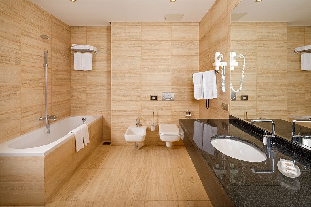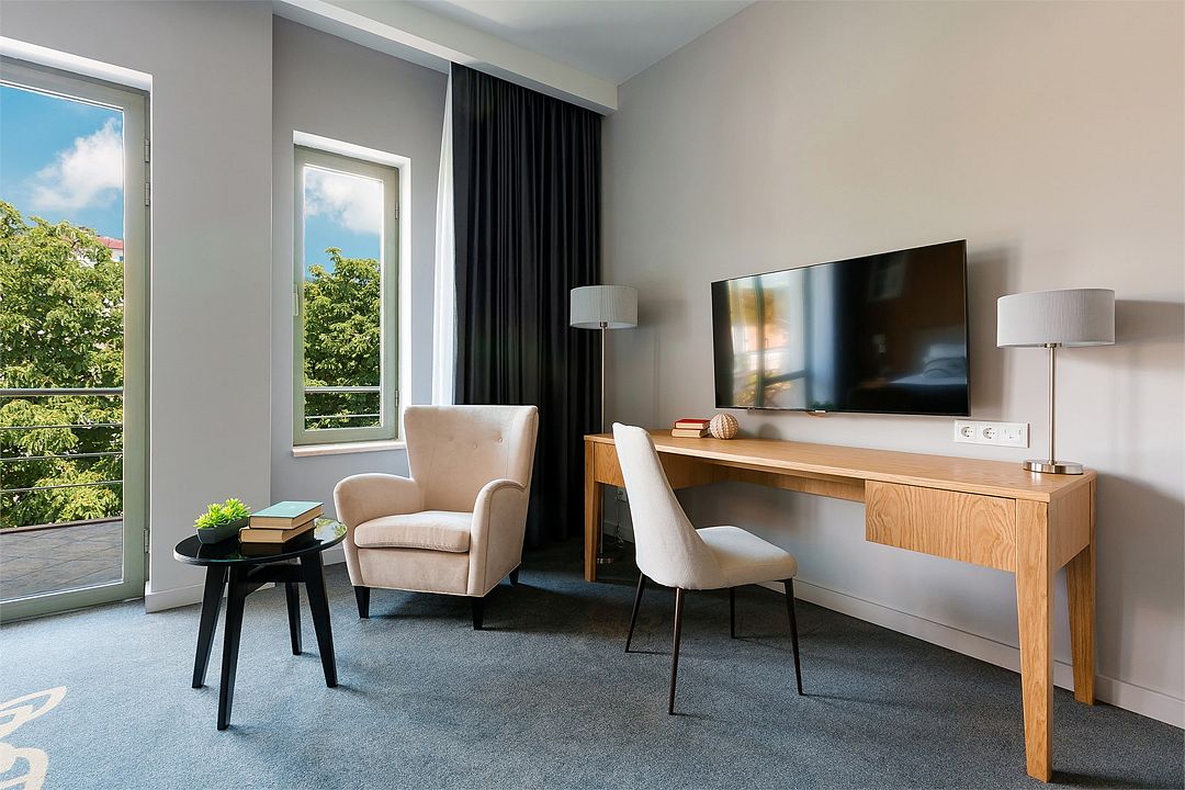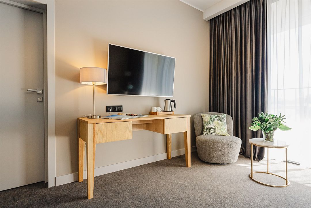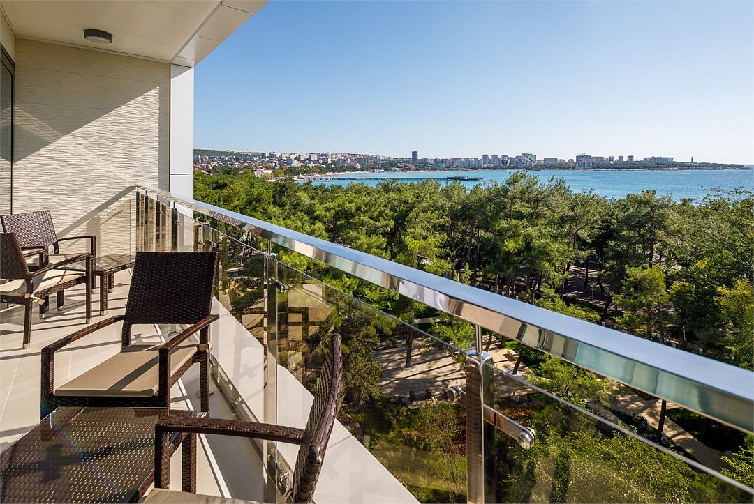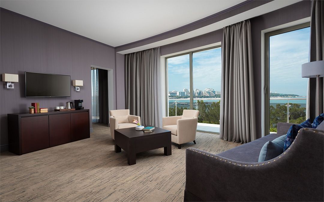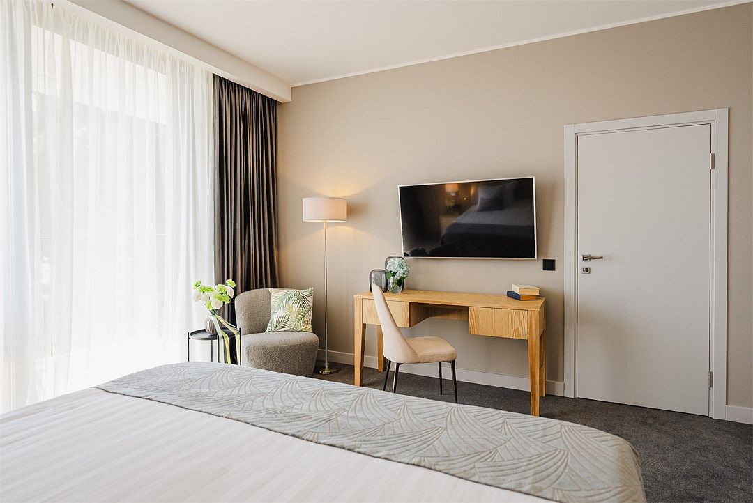 спутниковое телевидение, Wi-Fi, телефон, кондиционер, фен, ванна, санузел, халаты, банные полотенца, тапочки, гигиенические средства, косметические средства, балкон, две односпальные или большая двуспальная кровать, кресла, тумбы, вешалки, письменный стол, пуфики, мини-бар, чайный набор, сейф, косметическое зеркало, питьевая вода, ковровое покрытие, отопление, вид на море, кресло, стаканы, столовые приборы, стол, туалетные средства, телевизор с плоским экраном, шкаф-купе, можно с питомцами, игрушки, миска, пакетик для выгулаВ гостиничном номере