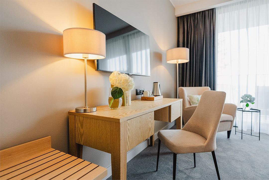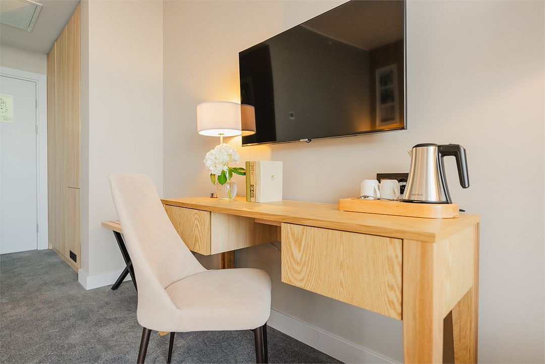 кабельное телевидение, Wi-Fi, фен, электронные замки, санузел, банные принадлежности, халаты, тапочки, гигиенические средства, две односпальные или большая двуспальная кровать, шкаф для одежды, чайный набор, сейф, вид на город, вид во двор, тумба, туалет, внутренний телефон, телевизор с плоским экраном, фанкойл, можно с питомцами, игрушки, миска, пакетик для выгулаВ гостиничном номере