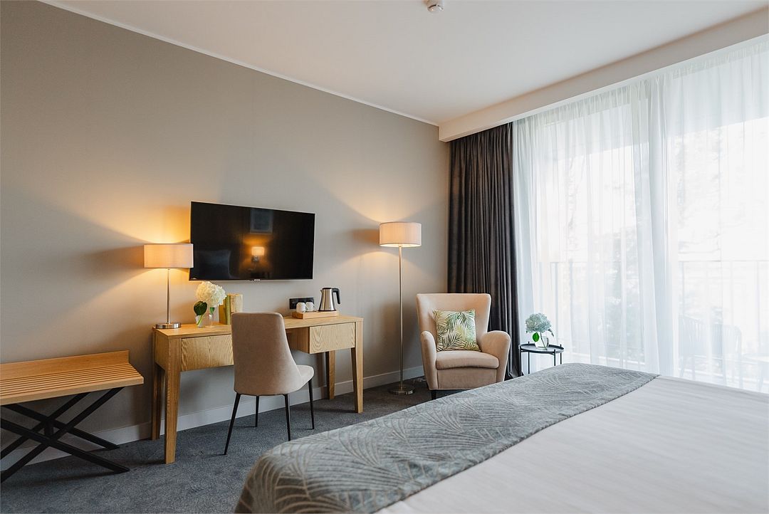 спутниковое телевидение, Wi-Fi, телефон, кондиционер, система климат-контроля, настольные лампы, фен, электронные замки, ванна, санузел, халаты, банные полотенца, тапочки, гигиенические средства, косметические средства, балкон, две односпальные или большая двуспальная кровать, шкаф для одежды, вешалки, зеркало, мини-бар, письменные принадлежности, чайный набор, обслуживание номеров, информационная карта, меню, сейф, косметическое зеркало, питьевая вода, отопление, кресло, стаканы, туалетные средства, телевизор с плоским экраном, вид на горы, можно с питомцами, игрушки, миска, пакетик для выгулаВ гостиничном номере