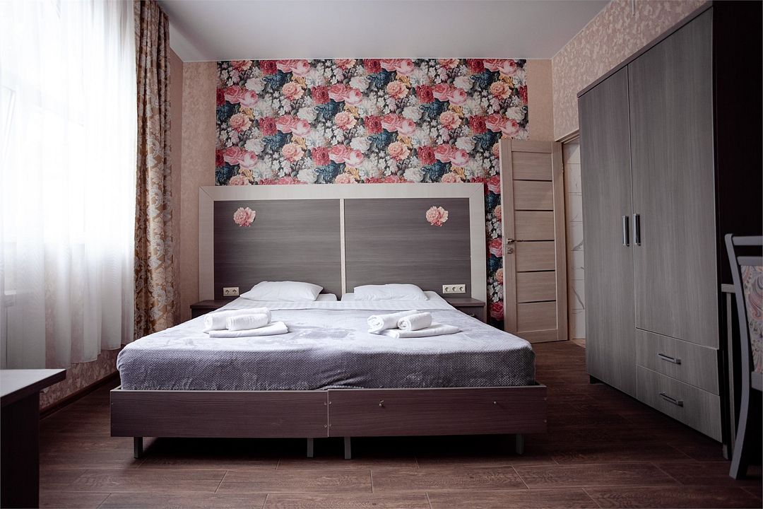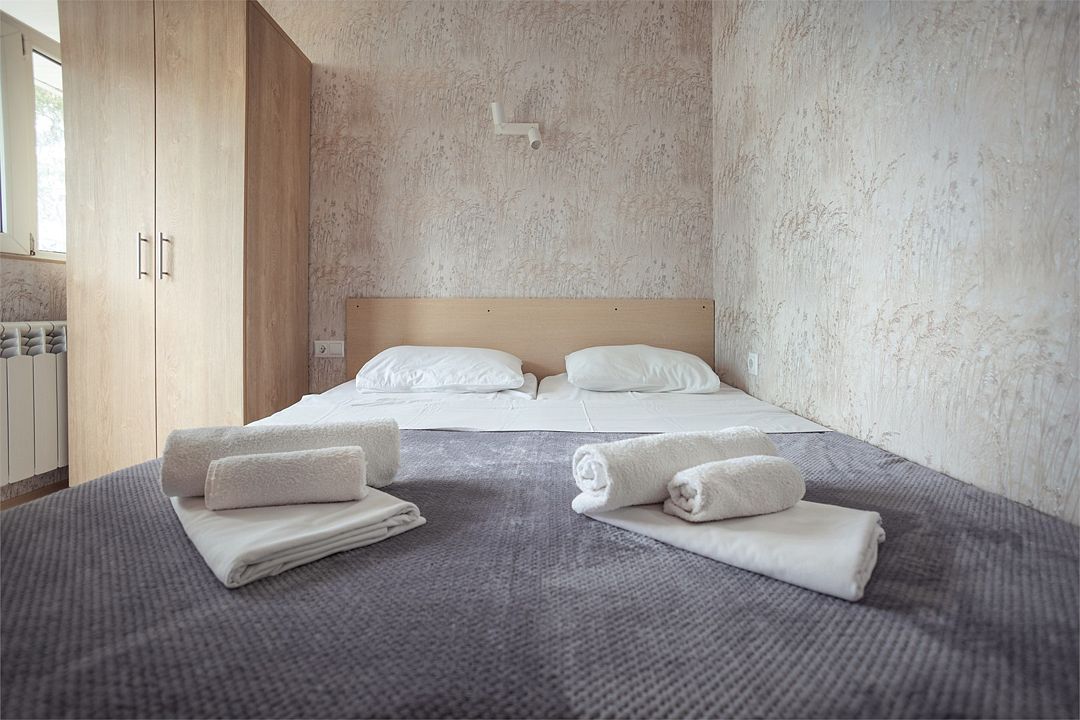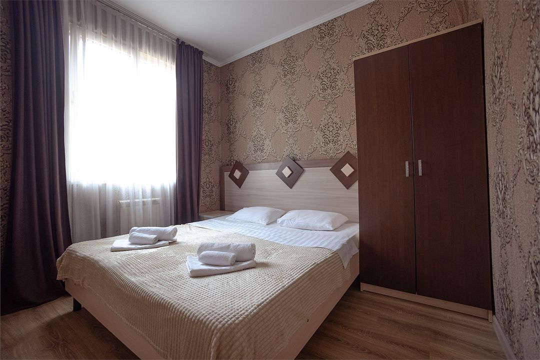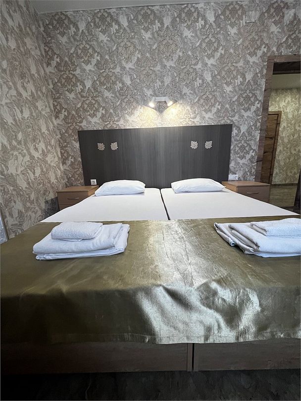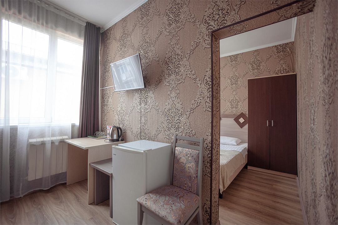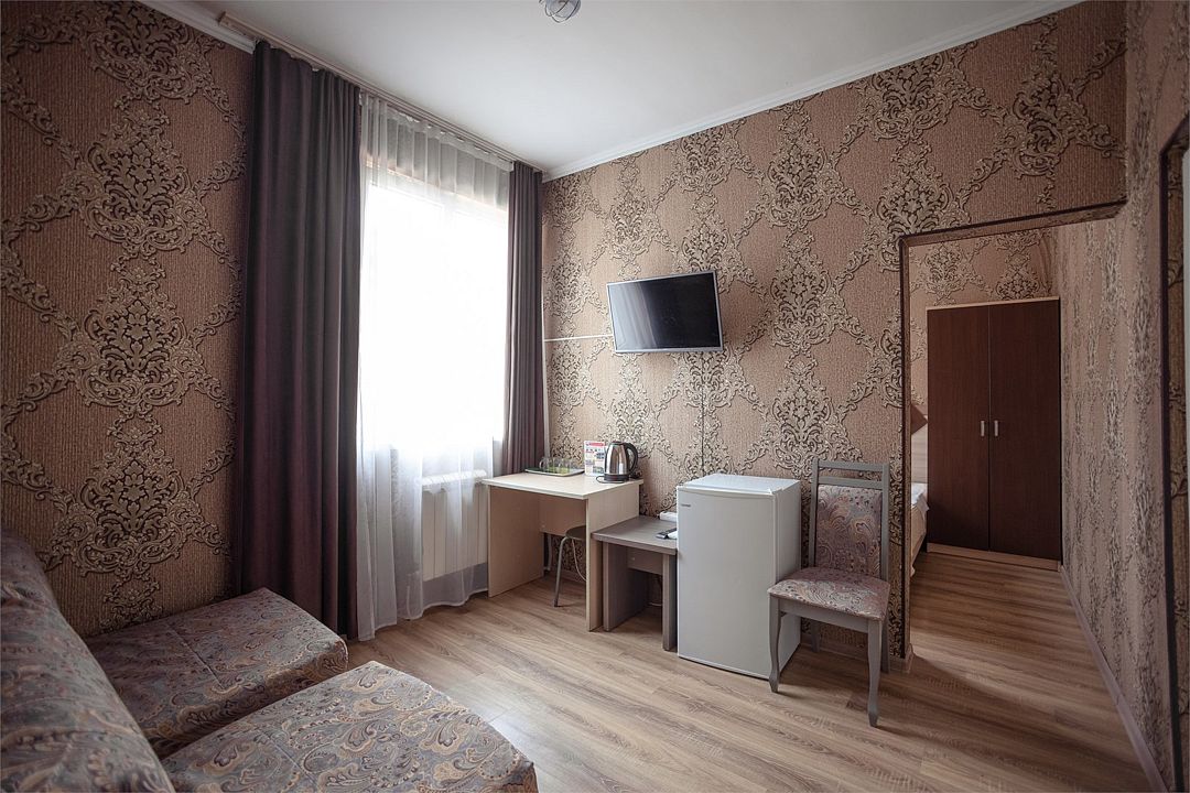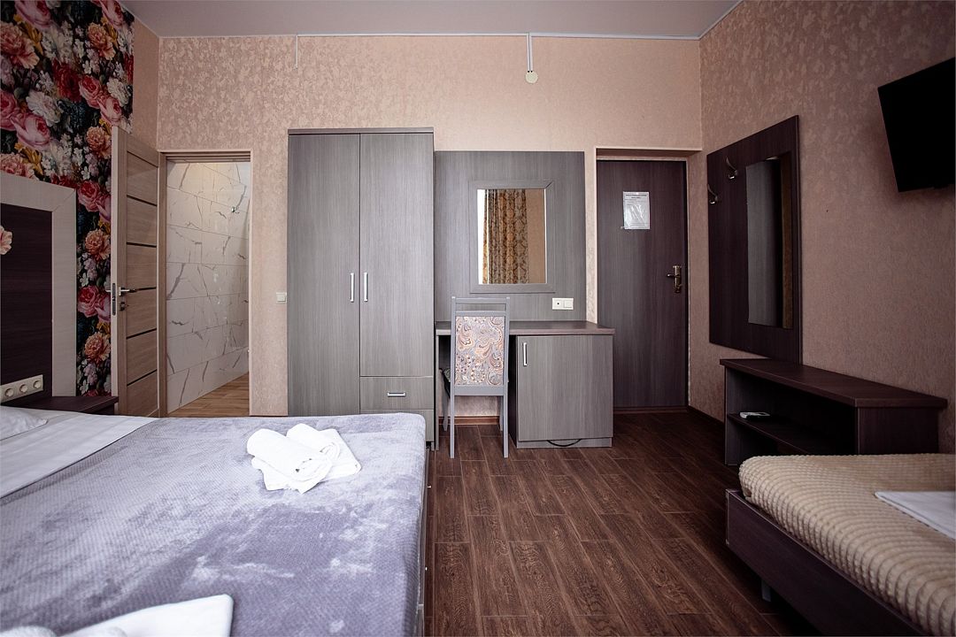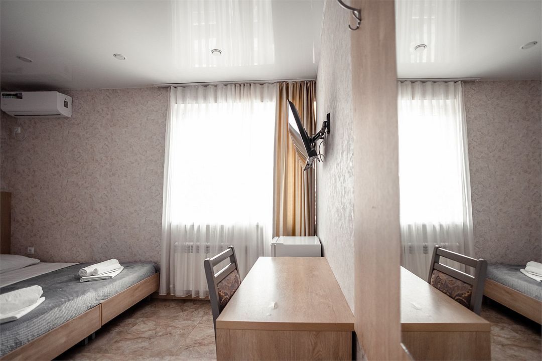 Двухкомнатный номер с одной двуспальной кроватью или двумя односпальными кроватями и двумя кресло-кроватями. Санузел, душ, плоский ЖК телевизор, кондиционер, холодильник, фен, интернет wi-fi, шкаф для одежды, стол, стулья, чайник, набор чайной посуды, утюг по требованию. Комнаты проходные. Номер без балкона.Услуги и удобства