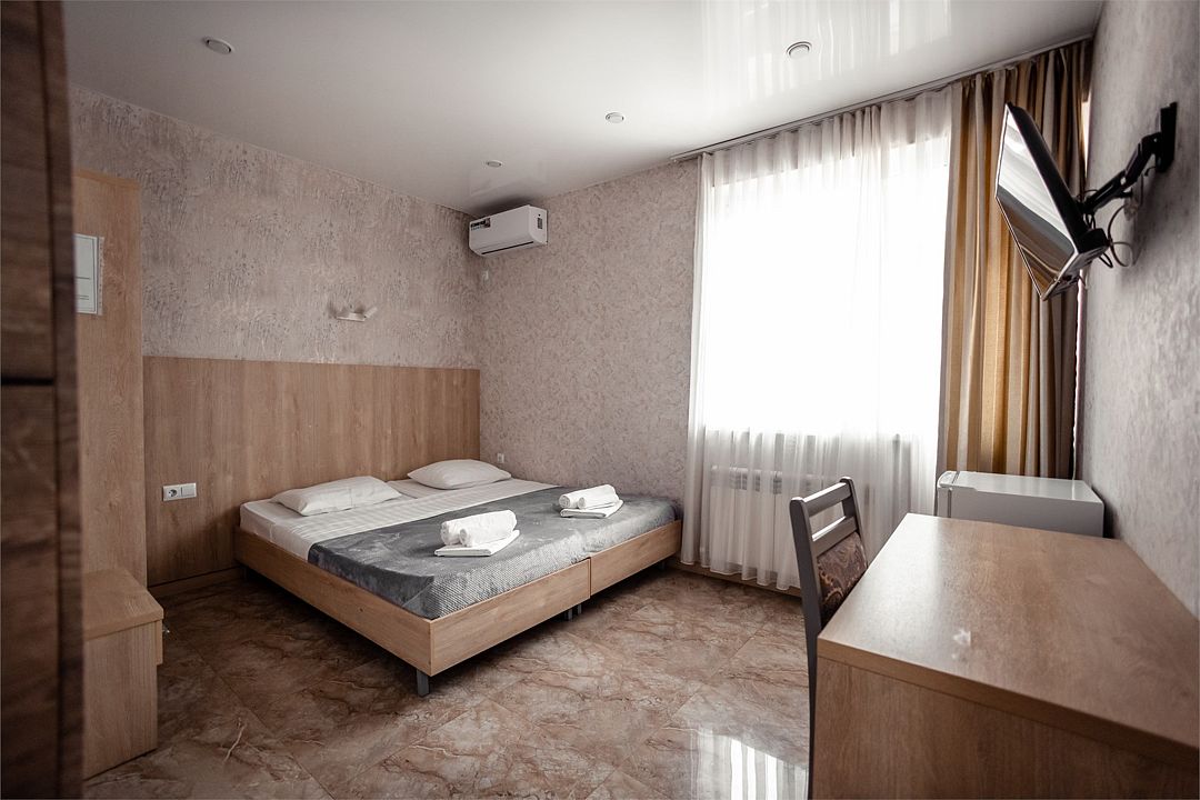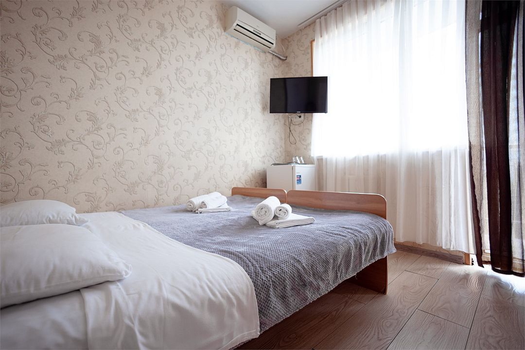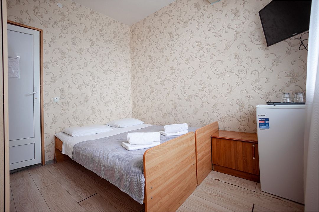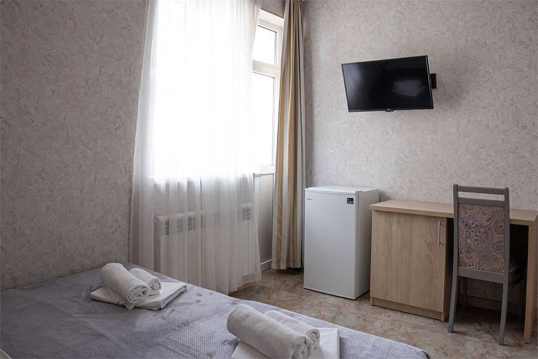 Двухместный эконом - номер с двумя односпальными кроватями. В номере: кондиционер, интернет wi-fi, ЖК телевизор с плоским экраном, холодильник, шкаф для одежды, зеркало, стул, тумба, чайный набор посуды, чайник на этаже, утюг по требованию. Индивидуальный санузел и душ находится на этаже рядом с номером, используется только экономномером. Номер с балконом.Услуги и удобства