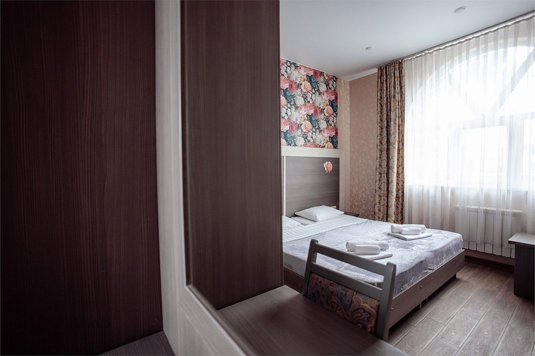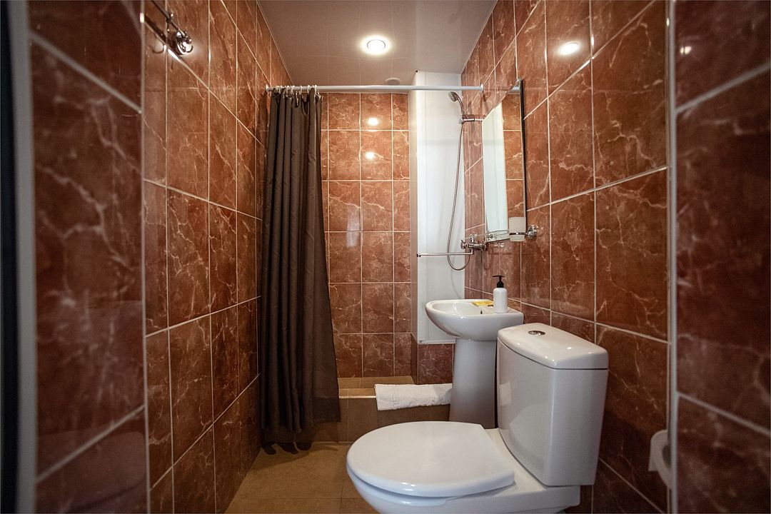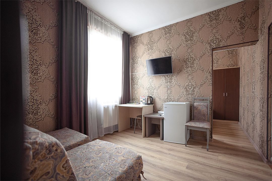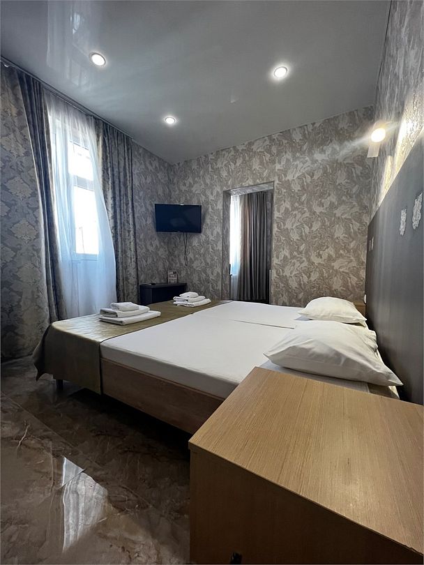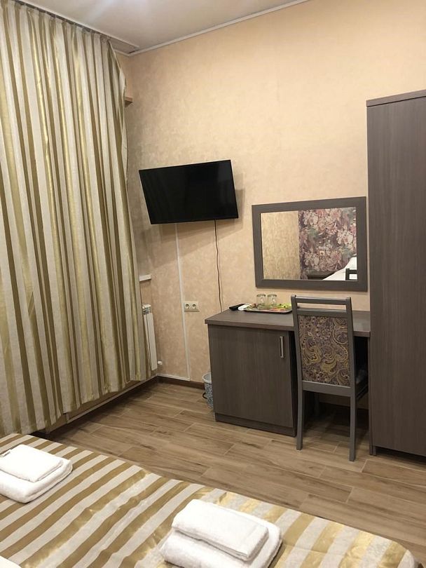 Двухместный эконом - номер с двумя односпальными кроватями. В номере: кондиционер, интернет wi-fi, ЖК телевизор с плоским экраном, холодильник, шкаф для одежды, зеркало, стул, тумба, чайный набор посуды, чайник на этаже, утюг по требованию. Индивидуальный санузел и душ находится на этаже рядом с номером, используется только экономномером. Номер с балконом.Услуги и удобства