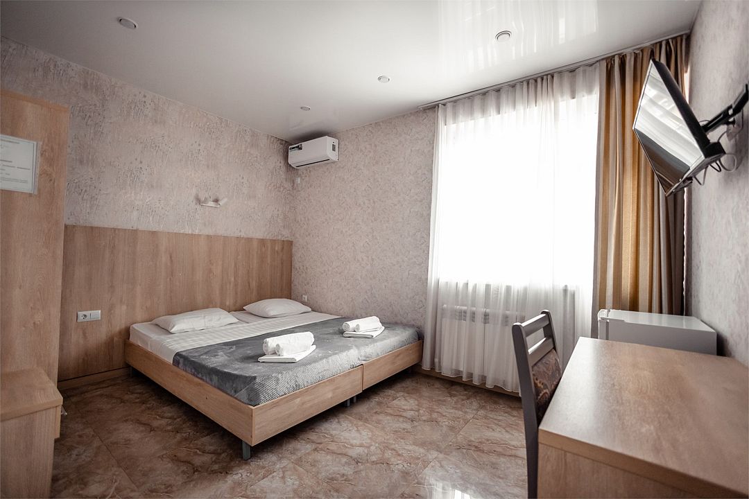 Стандартный двухместный номер с одной двуспальной кроватью или двумя односпальными кроватями. В номере есть санузел, душ, плоский ЖК телевизор, кондиционер, холодильник, фен, интернет wi-fi, шкаф, чайный набор посуды, утюг по требованию. Номер с общим балконом.Услуги и удобства