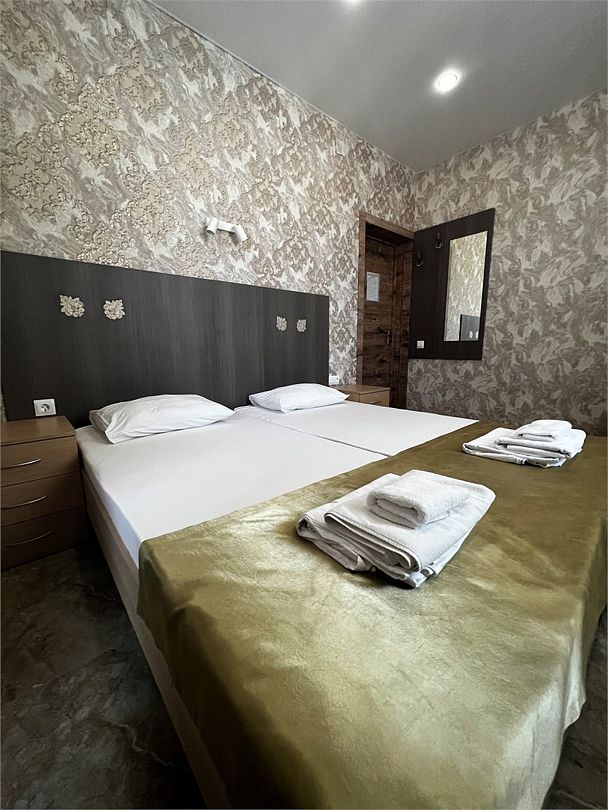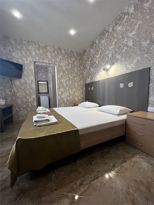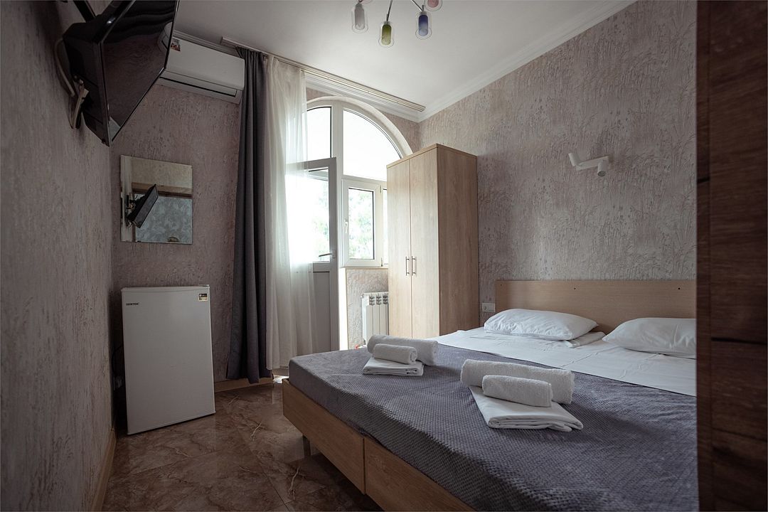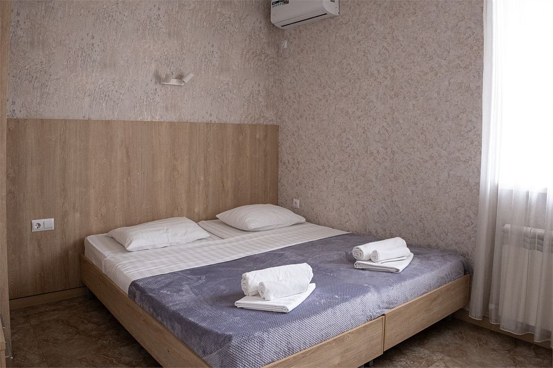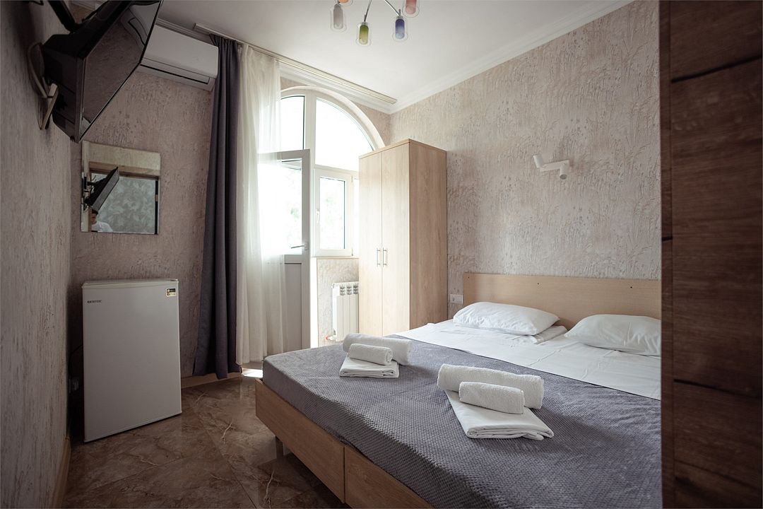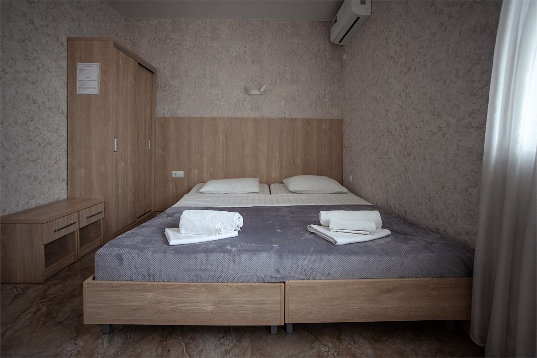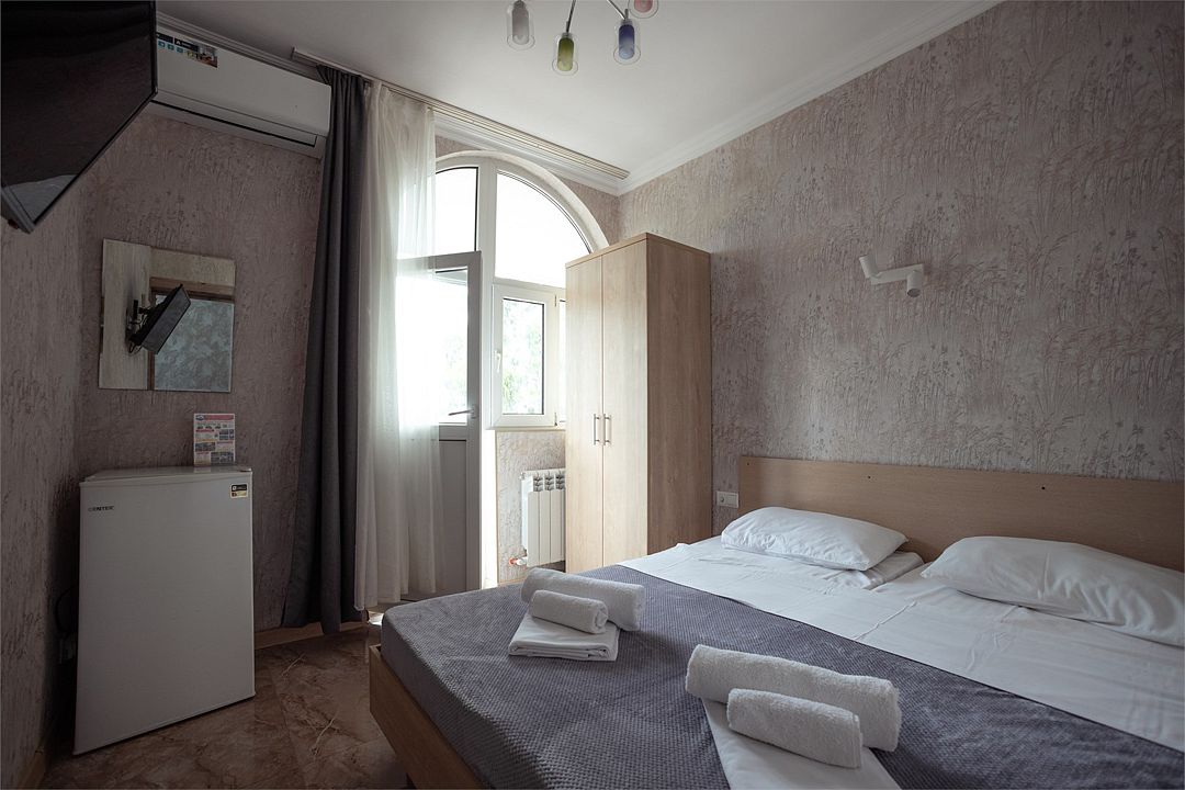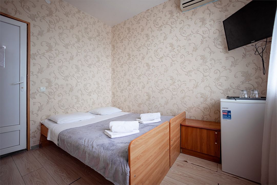 Комфортный двухместный номер с одной двуспальной кроватью или двумя односпальными. Санузел, душ, плоский ЖК телевизор, кондиционер, холодильник, фен, интернет wi-fi, шкаф для одежды, набор чайной посуды. Номер с балконом, боковым видом на море. Чайник на этаже, утюг по требованию.Услуги и удобства