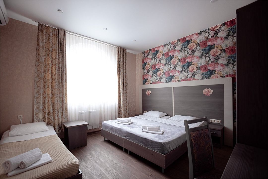 Комфортный трехместный номер с тремя односпальными кроватями или одной 2х-спальной и одним креслом-кроватью. В номере ванная комната, душ, туалет, фен, холодильник, плоский ЖК телевизор, интернет wi-fi, кондиционер, прикроватные тумбы, стол, чайный набор посуды, шкаф для одежды. Чайник на этаже, утюг по требованию. Номер без балкона.Услуги и удобства