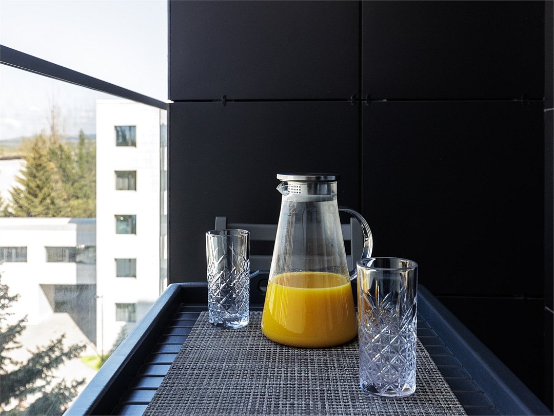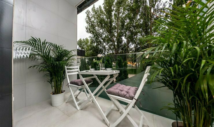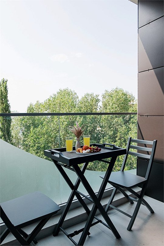 Двухместный номер с балконом и кроватью "King Size". Оборудован телевизором с плоским экраном, зоной для отдыха на балконе, сплит-системой и шторами, не пропускающими свет. В распоряжении гостей полностью оборудованная кухня с мини-холодильником, душ, туалет, фен, бесплатные туалетно-косметические принадлежности.