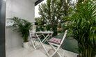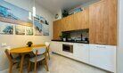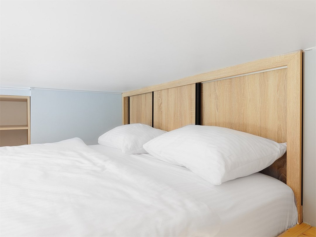 Трехместный номер с балконом и кроватью "King Size", вторая кровать на втором ярусе. Оборудован телевизором с плоским экраном, сплит-системой и шторами, не пропускающими свет. В распоряжении гостей полностью оборудованная кухня, душ, туалет, фен и бесплатные туалетно-косметические принадлежности, мебель на балконе.