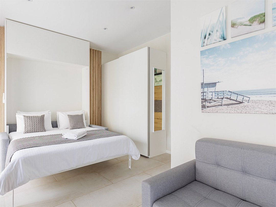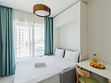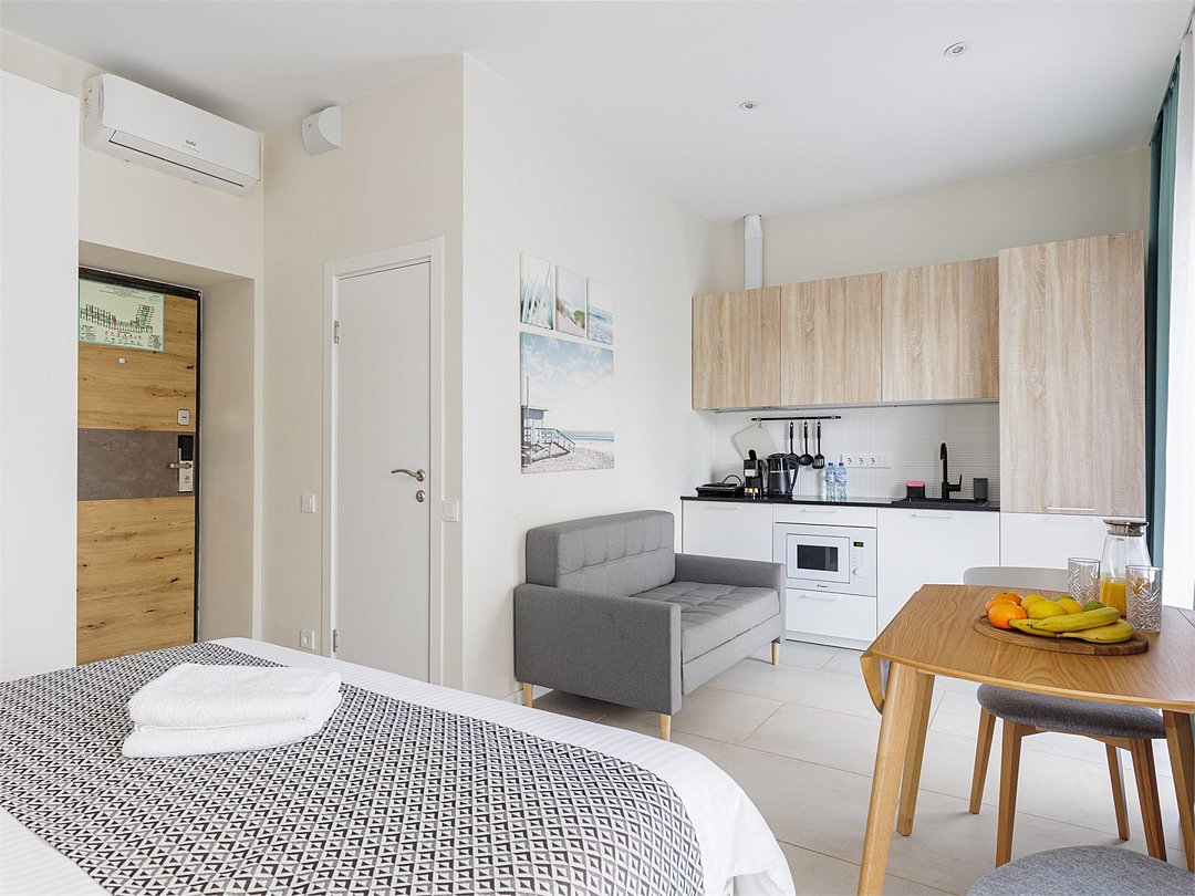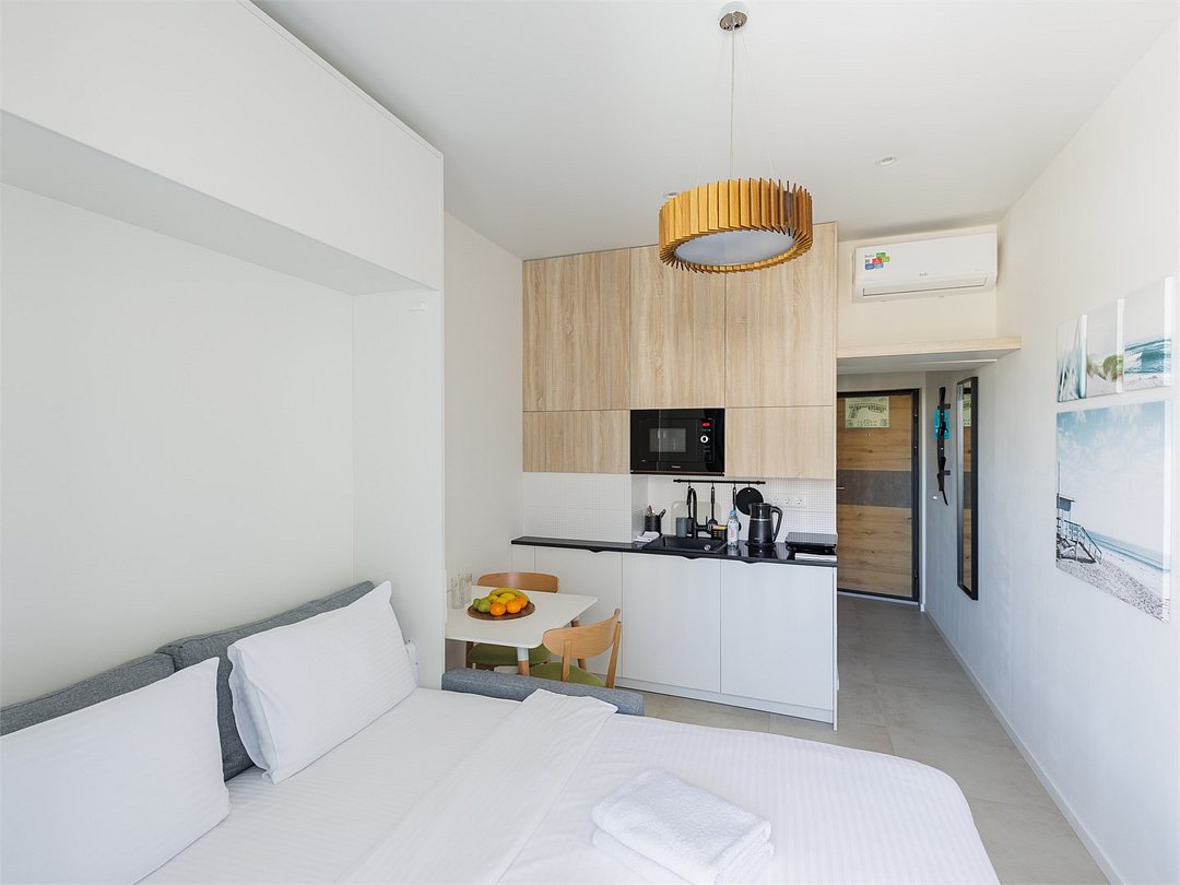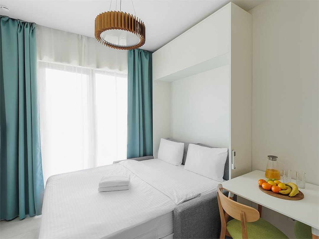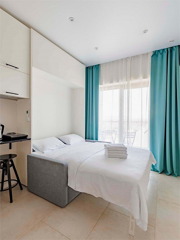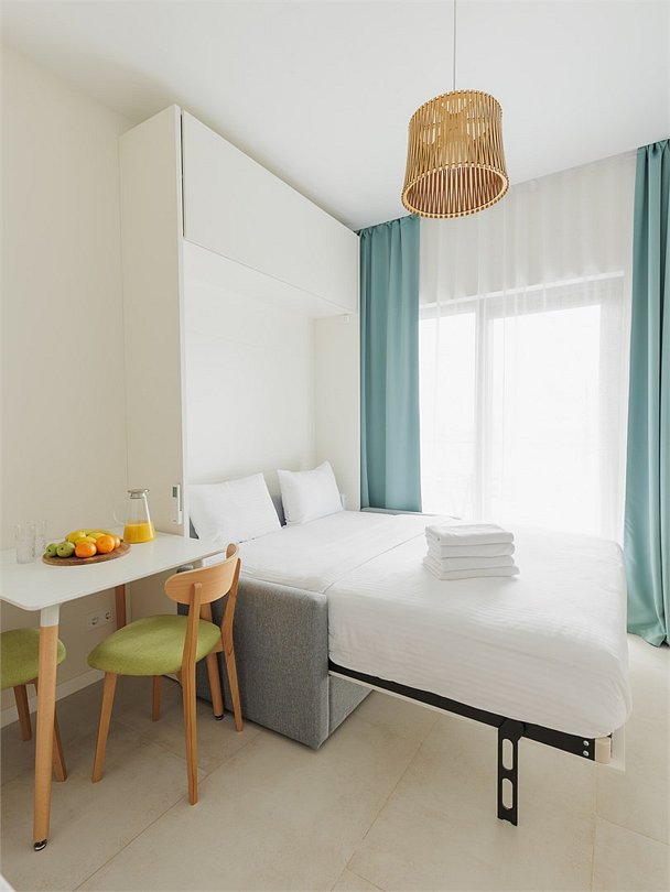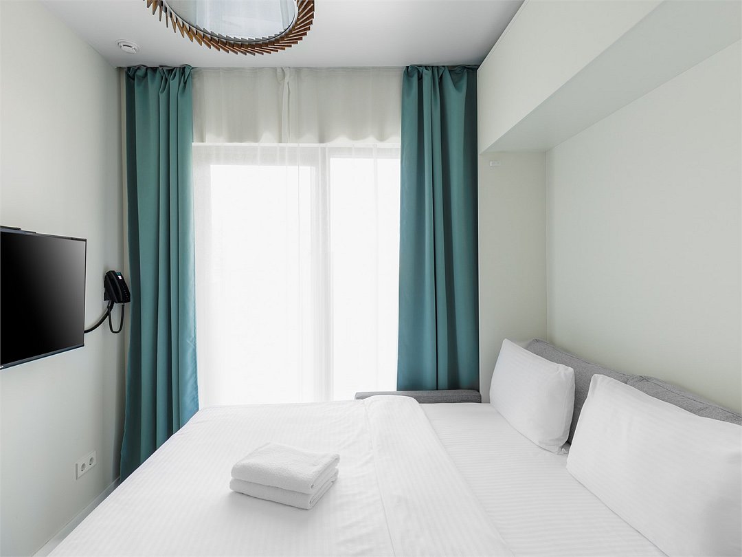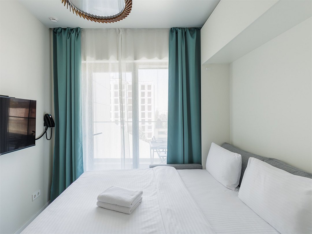 Двухместный номер без балкона и кроватью "King Size". Оборудован телевизором с плоским экраном, сплит-системой. В распоряжении гостей полностью оборудованная кухня с мини холодильником, душ, туалет, фен, бесплатные туалетно-косметические принадлежности. Кровать-трансформер позволяет при желании преобразить зону спальни в зону отдыха. Все номера данной категории с видом на внутренний двор и бассейн.