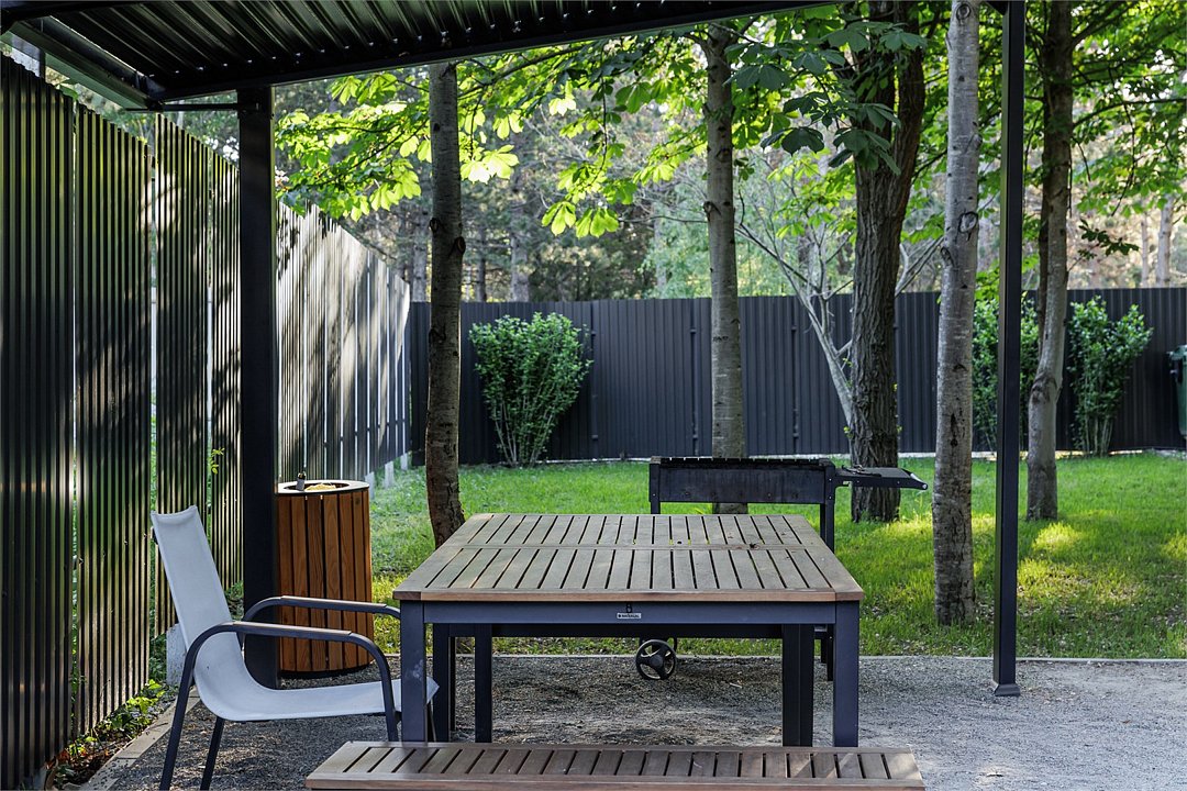 Три крытых зоны отдыха с мангалами оборудованы столами, скамейками, раковиной с водой и санузлом.