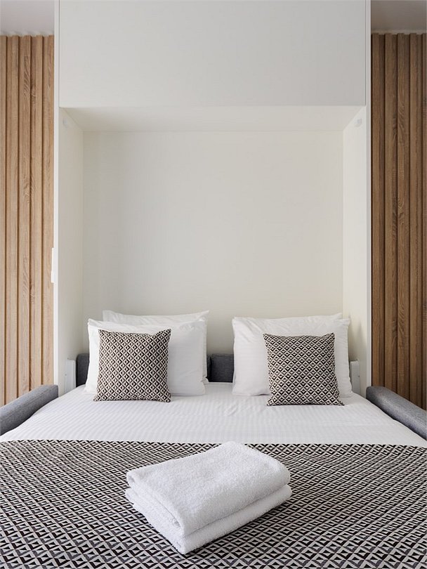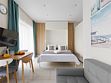 Просторный номер с кроватью-трансформер "King Size" и дополнительным местом, а также большим балконом. Оборудован телевизором с плоским экраном, зоной для отдыха, сплит-системой и шторами, не пропускающими свет. В распоряжении гостей кухня с холодильником, кофемашина, утюг и гладильная доска, сейф. Бесплатные туалетно-косметические принадлежности, халаты и тапочки.