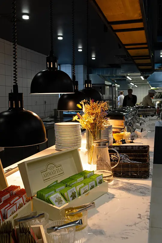 Особая гордость ресторана — изысканная шведская линия, где вас ждёт впечатляющее разнообразие любимых блюд, приготовленных из свежайших местных продуктов. Здесь вы сможете наслаждаться широким выбором блюд и напитков: ароматным кофе, чаем, натуральными морсами, а также включённым в стоимость алкоголем — пивом, тихими и игристыми винами. Всё это доступно для вас в неограниченном количестве.