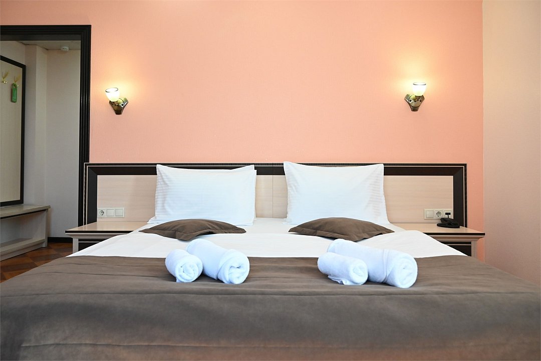 Номер «Супериор» представляет собой улучшенный «Стандартный номер». Одним из важных преимуществ этого номера является наличие балкона, на котором несомненно приятно выпить чашечку горячего кофе. Удобства: телевизор с плоским экраном, холодильник, кондиционер, электронный сейф, телефон с внутренней связью, а также уютный махровый халат и тапочки, а в душевой комнате – фен и набор косметических средств. В номерах качественная мебель (кровать, шкаф, письменный стол, журнальный стол, кресло), пол отделан высококачественным ламинатом, в номере есть небольшая прихожая. Приятное освещение номеров и интересный интерьер оставят только самые приятные воспоминания о Вашем отдыхе. Вы можете выбрать номер «Супериор» как с одной большой двуспальной, так и с двумя отдельными односпальными кроватями.Услуги и удобства