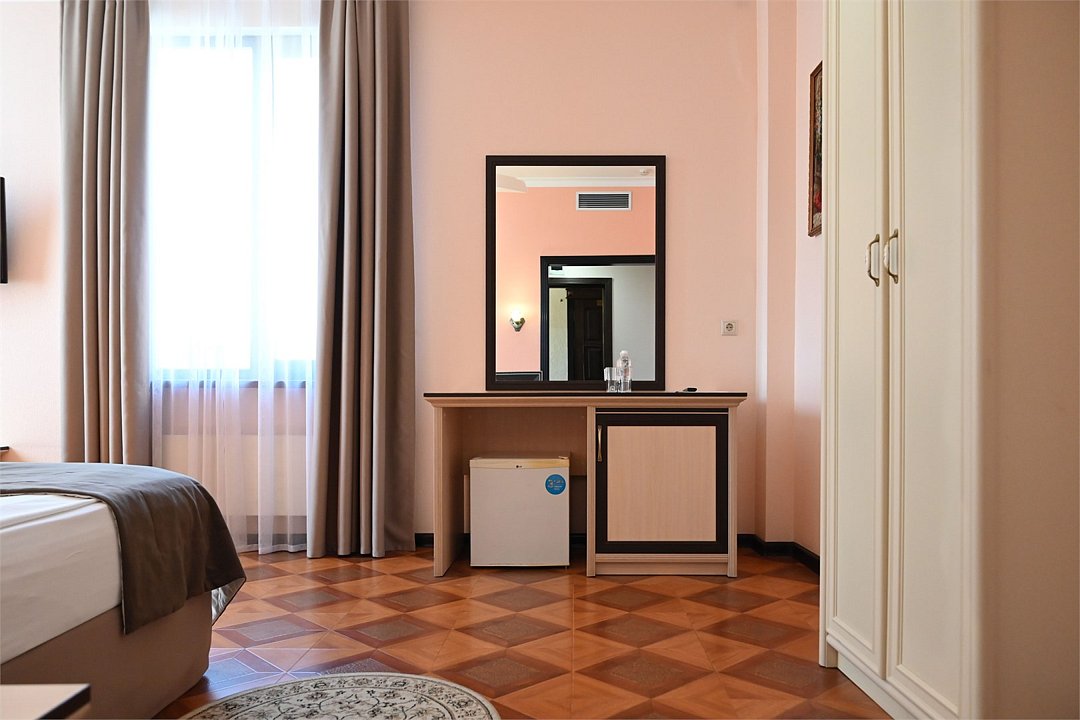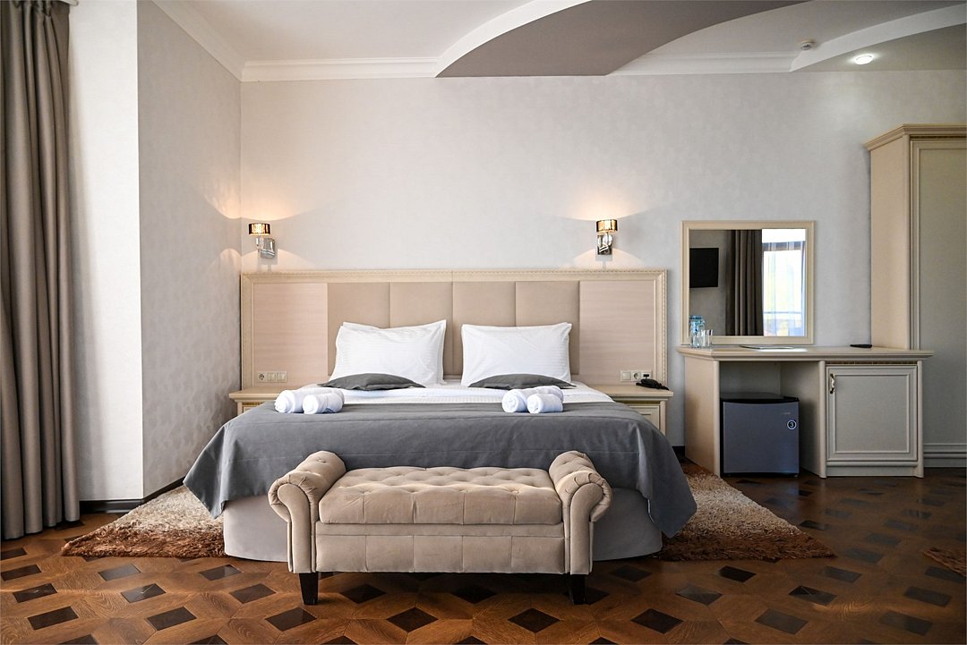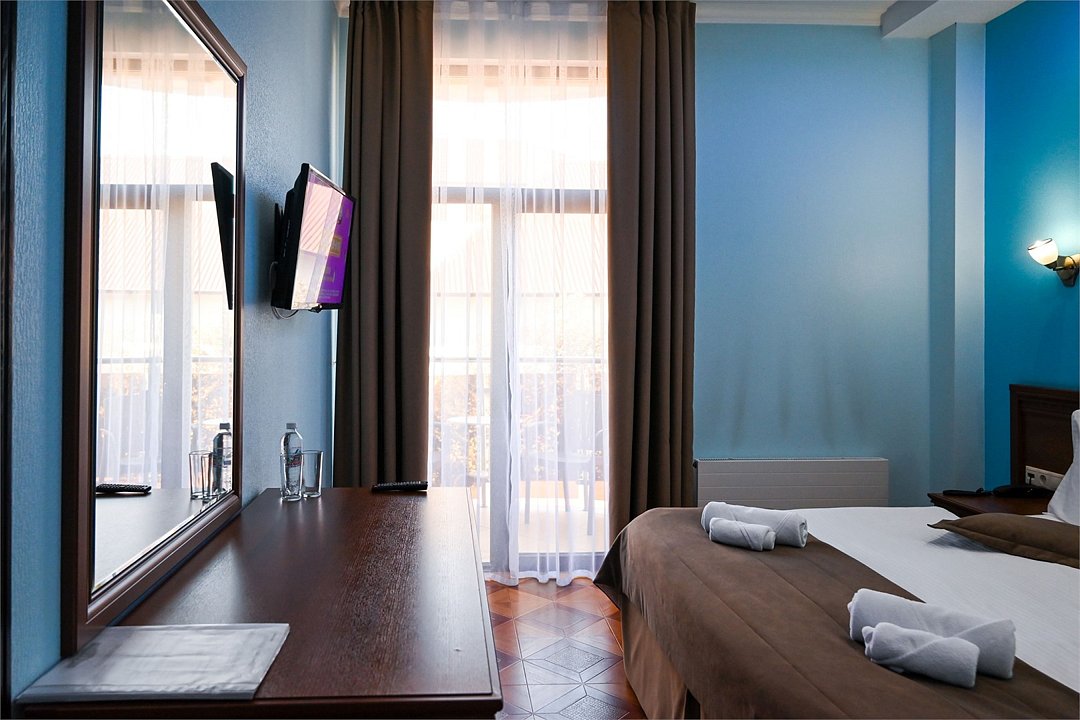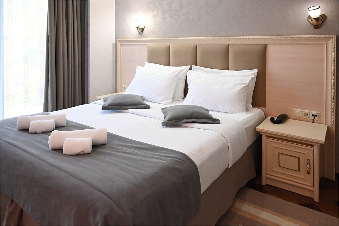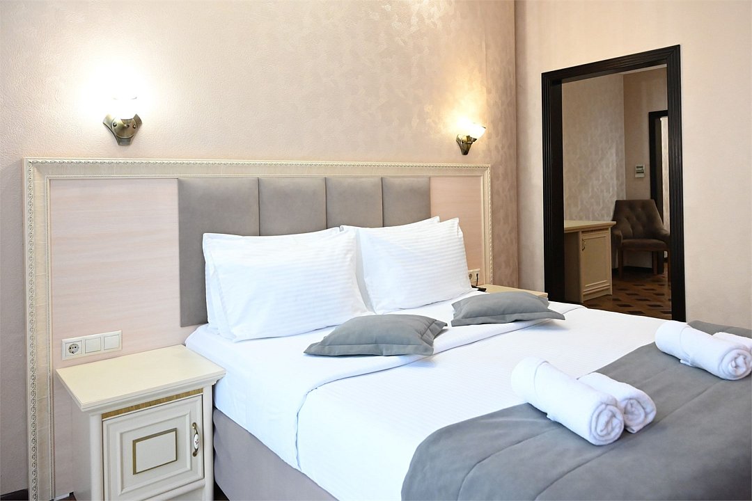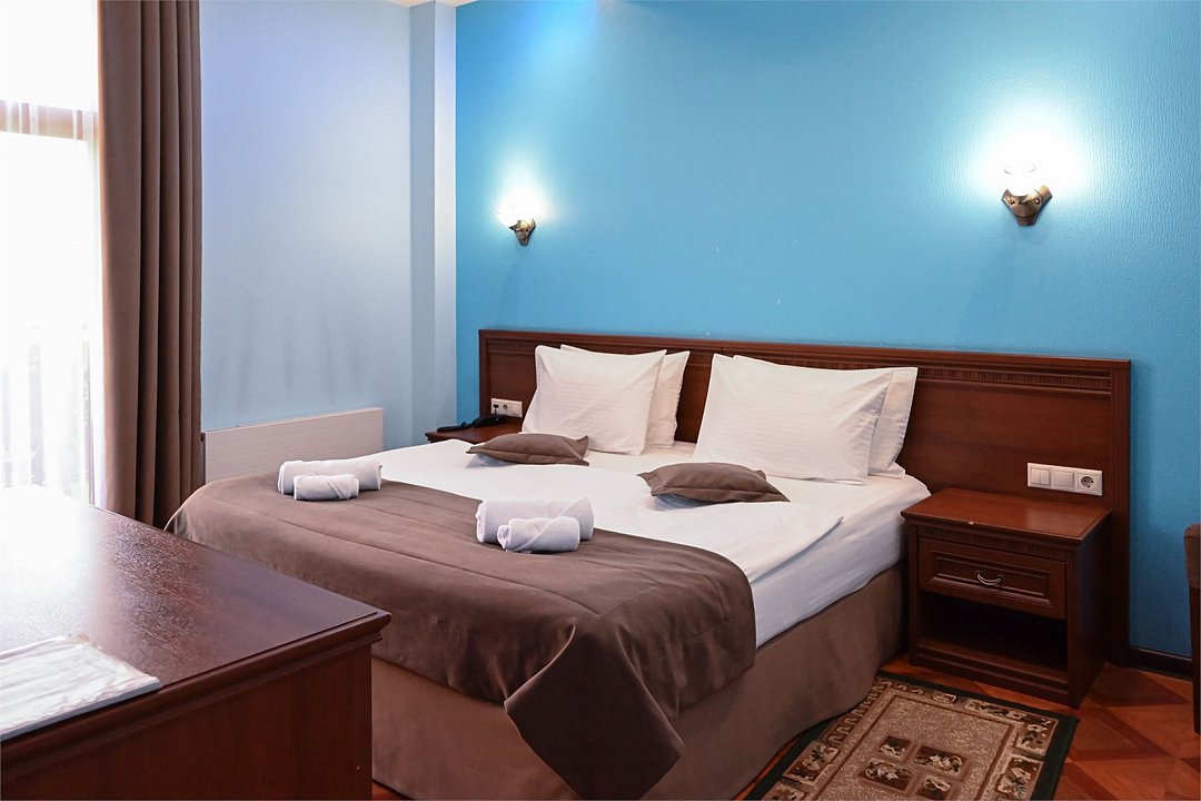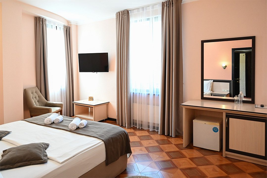 Пятиэтажный корпус отеля (без лифта) разместился на тихой и зеленой улице города. Гостей ожидают двухместные номера категории Стандарт, Супериор, Делюкс и Люкс. В номерах стильный интерьер и современна удобная мебелью Каждая комната оснащена собственным санузлом и сплит-системой, есть бытовая техника — телевизор, холодильник.