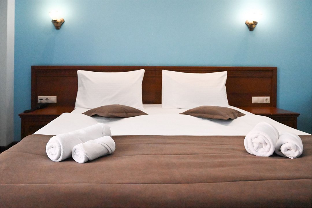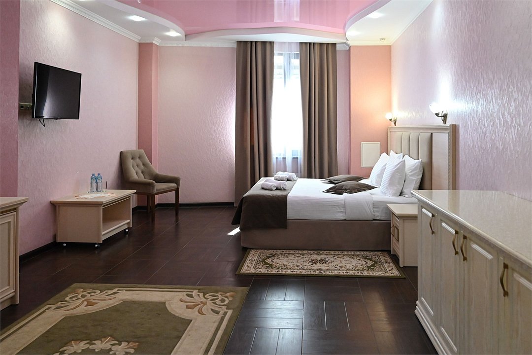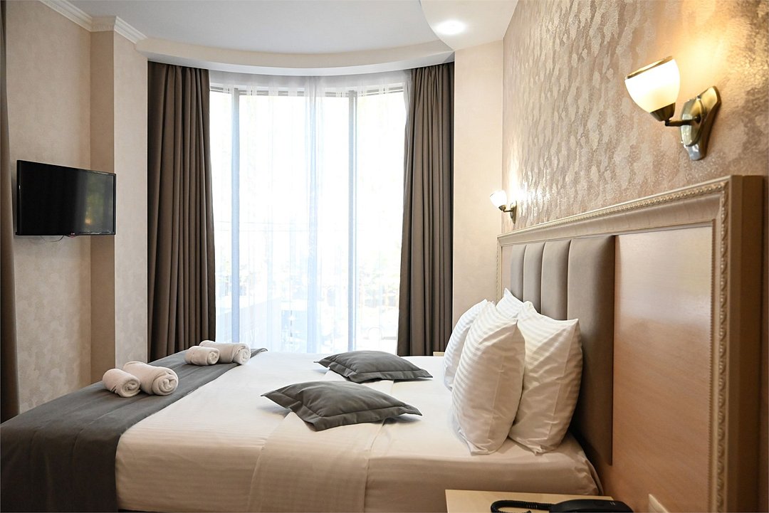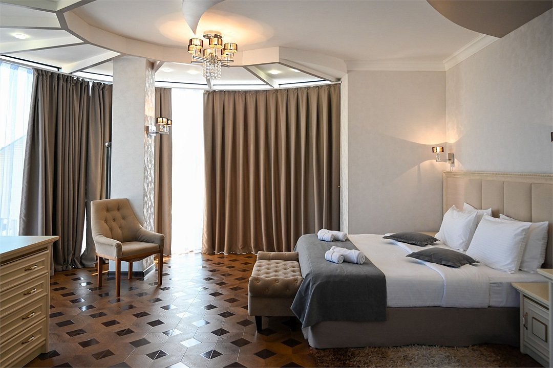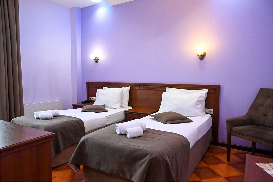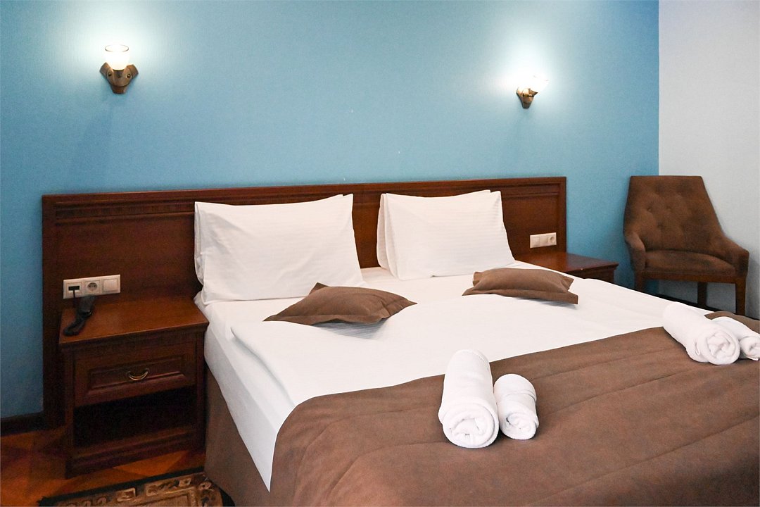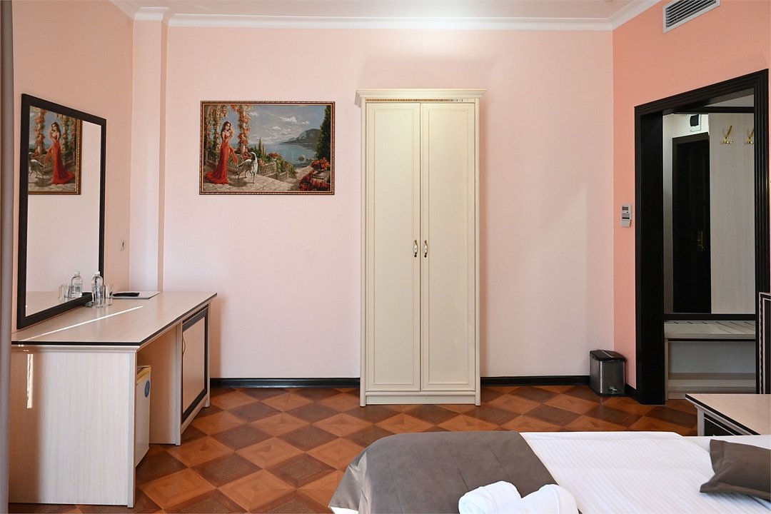 Пятиэтажный корпус отеля (без лифта) разместился на тихой и зеленой улице города. Гостей ожидают двухместные номера категории Стандарт, Супериор, Делюкс и Люкс. В номерах стильный интерьер и современна удобная мебелью Каждая комната оснащена собственным санузлом и сплит-системой, есть бытовая техника — телевизор, холодильник.