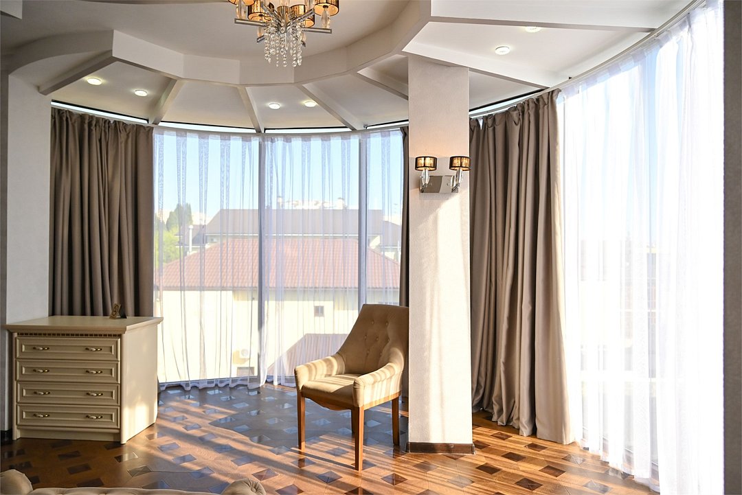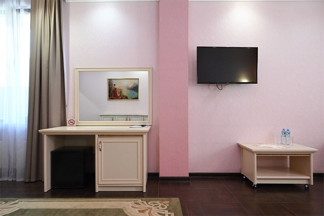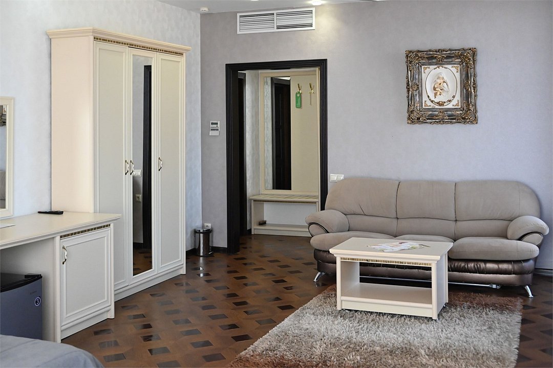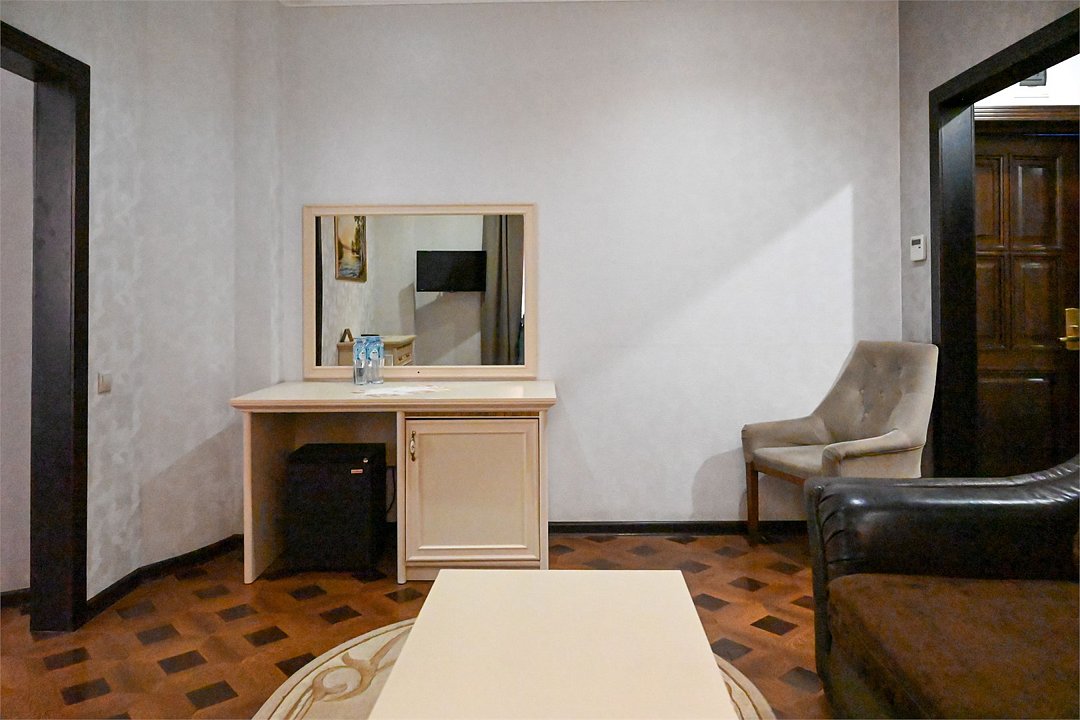 Номер с шикарной отделкой в классическом стиле. Обставлен современной и удобной мебелью, особый уют создают продуманная система подсветки, ковровое покрытие на полу, контрастные тяжёлые портьеры. Окна номера выходят на запад, после обеда комната ярко освещена южным солнцем.Услуги и удобства