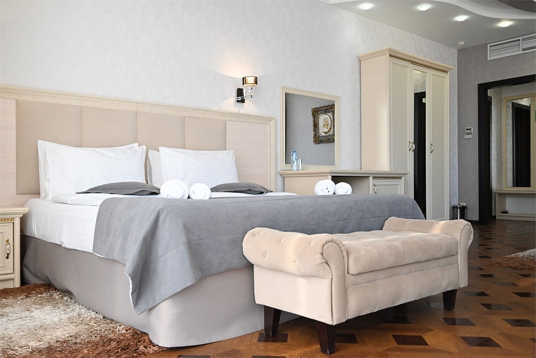 Роскошный номер с дизайнерской отделкой в сдержанных тонах. Имеет просторную площадь, панорамные окна обеспечивают потрясающий вид. В номере собственный балкон, окна выходят на южную сторону, поэтому утром комната залита ярким светом.Услуги и удобства