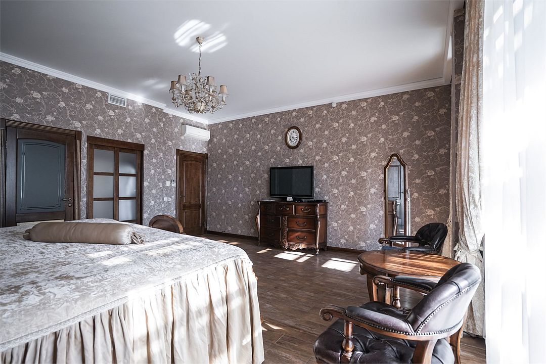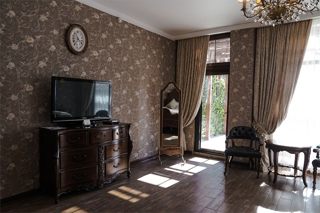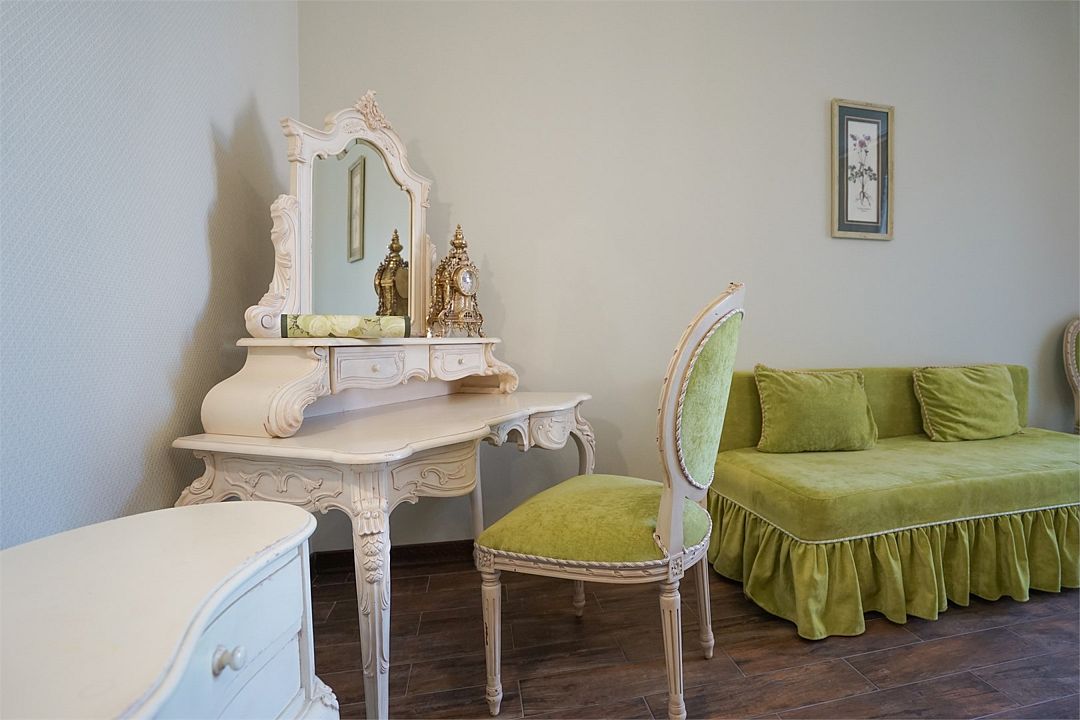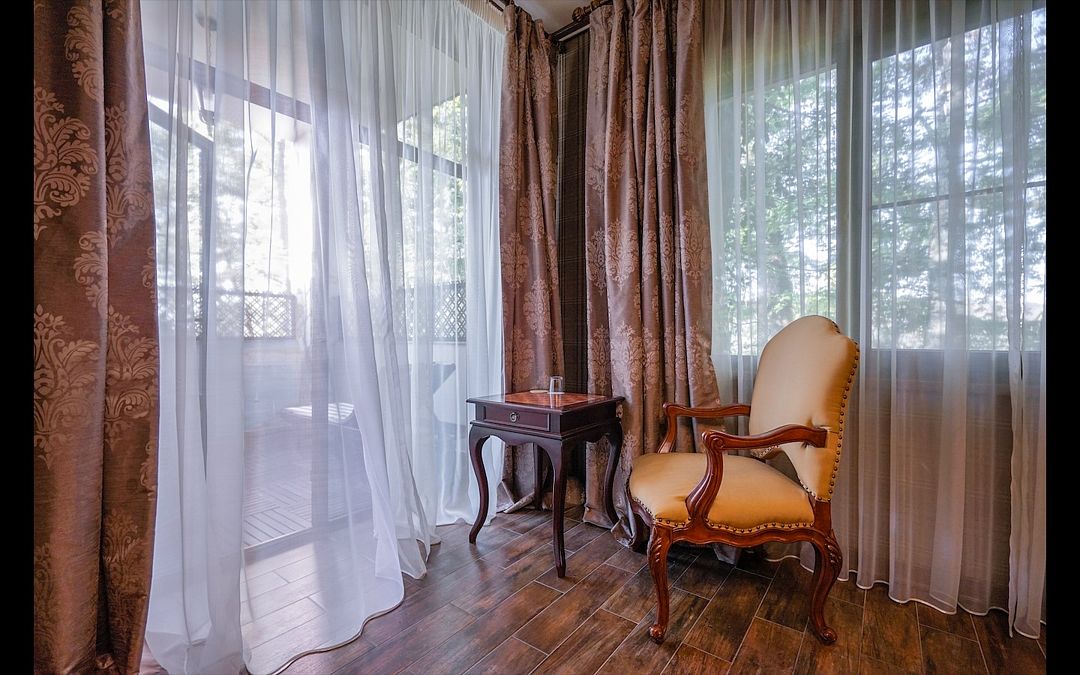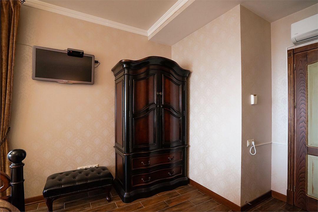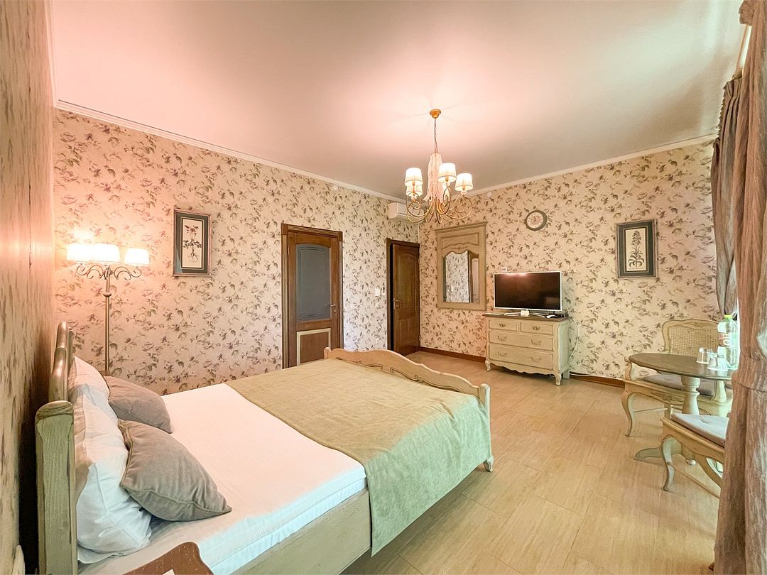 Просторный номер площадью 36 м² расположен на втором этаже корпуса Вилла. Интерьер выполнен в роскошном европейском стиле, в теплых, пастельных тонах и укомплектован эксклюзивной мебелью из благородных пород дерева.