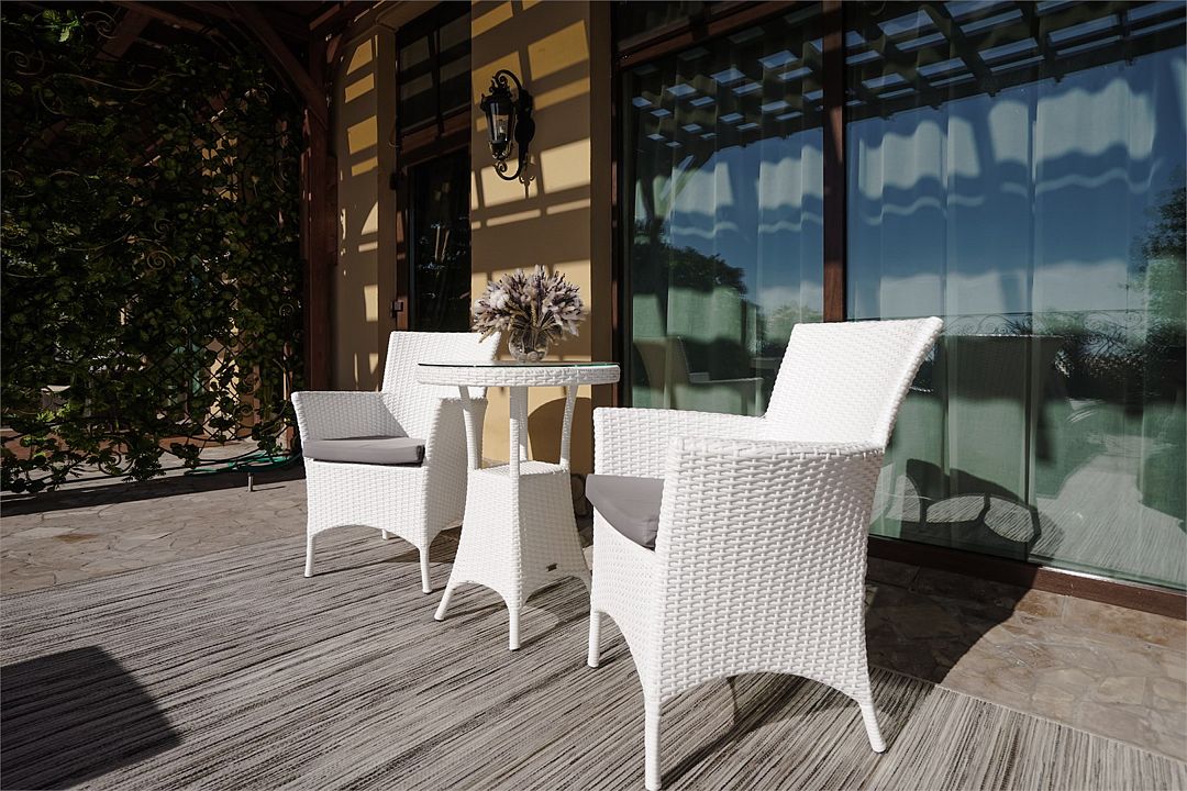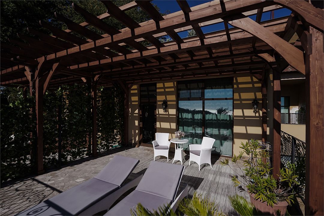 Открытая терраса является настоящим уголком для отдыха, где можно удобно устроиться на шезлонгах и насладиться свежим воздухом и солнечными лучами, окруженными экзотической растительностью. Джакузи приносит множество пользы для здоровья: улучшает тонус кожи и стимулирует кровообращение, оптимизирует работу сердечно-сосудистой и пищеварительной систем, а также помогает расслабиться и достичь внутренней гармонии.