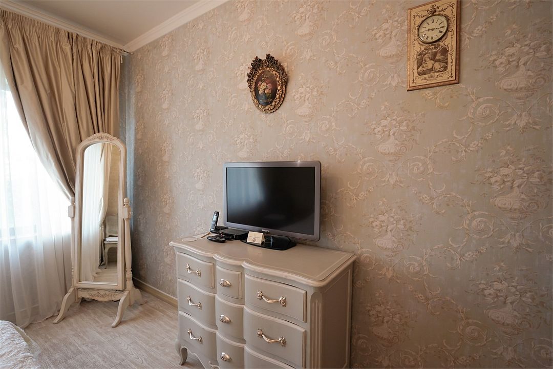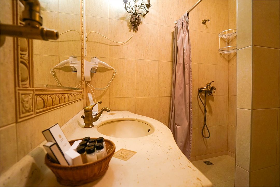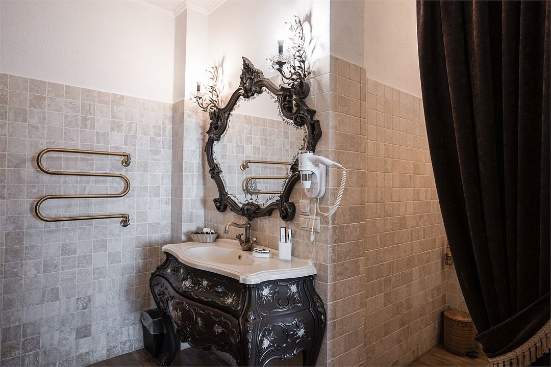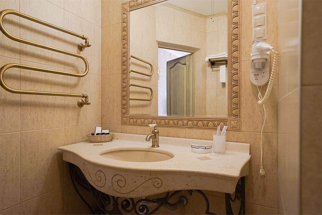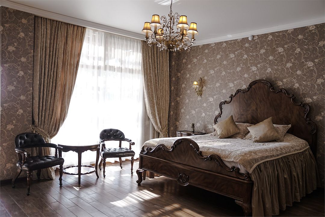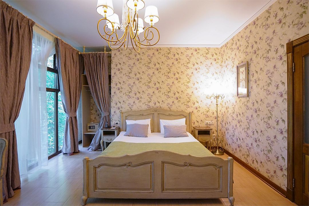 Великолепный номер площадью 26м² расположен на третьем этаже Главного корпуса. Интерьер выполнен в благородном цвете с цветочным орнаментом. Укомплектован эксклюзивной мебелью из натуральных пород дерева.