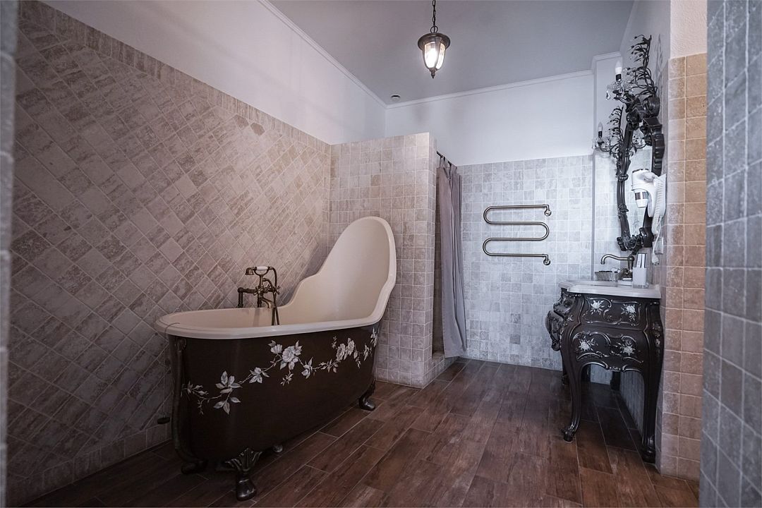 Роскошный просторный номер площадью 40 м² и высотой потолков 4,2 м² расположен на третьем этаже Главного корпуса. Интерьер выполнен в теплых благородных тонах цвета спелой сливы и укомплектован эксклюзивной мебелью из благородных пород дерева.