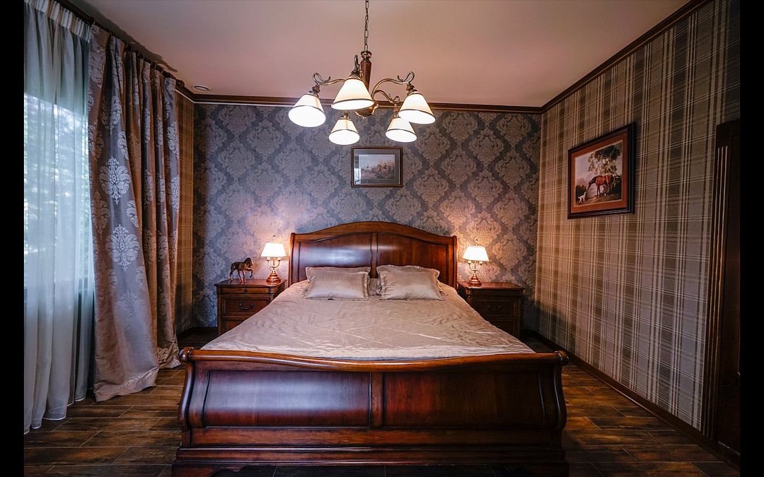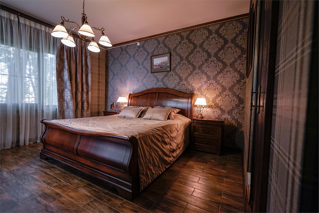 Большой стильный номер площадью 31 м² расположен на третьем этаже Главного корпуса. Интерьер выполнен в английском стиле, в темных, пастельных тонах и укомплектован эксклюзивной мебелью из благородных пород дерева.