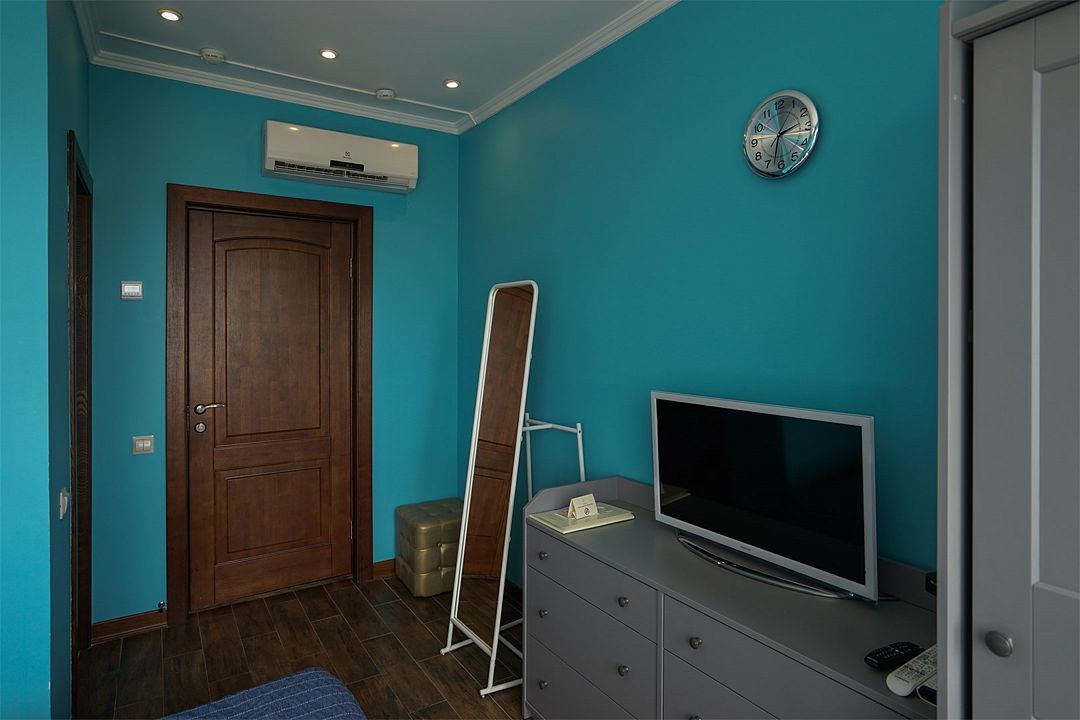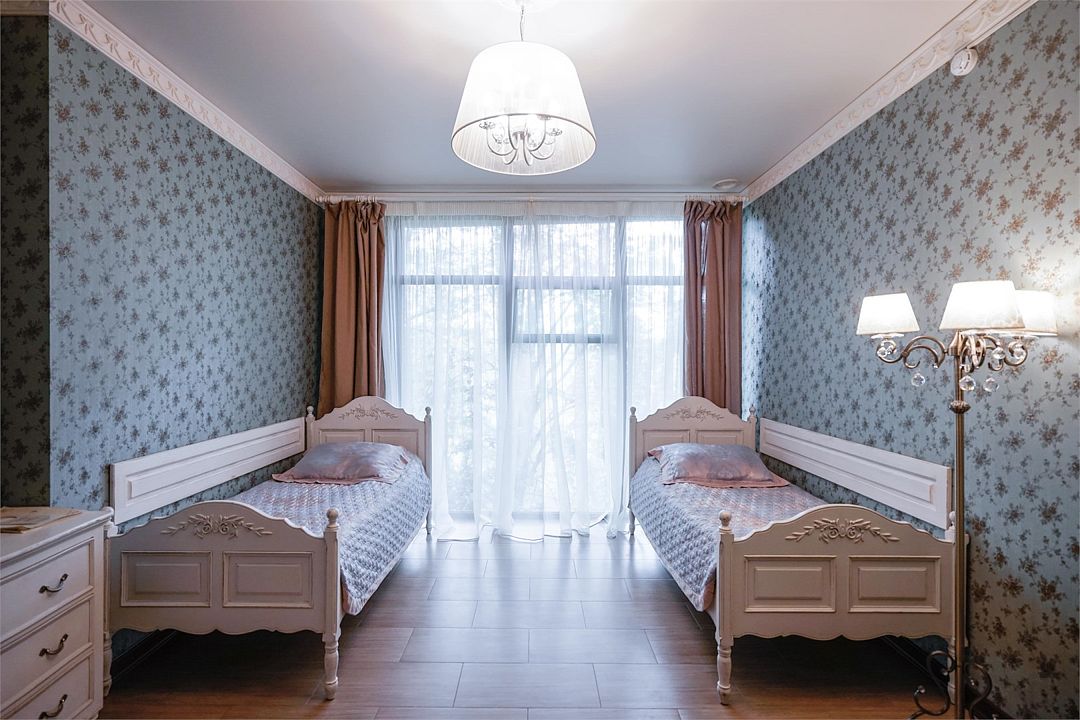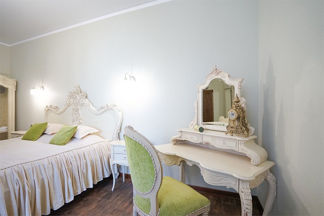 Уютный светлый номер площадью 21 м² расположен на третьем этаже Главного корпуса. Интерьер выполнен в бело-голубой гамме с эксклюзивной мебелью из благородных пород дерева.
