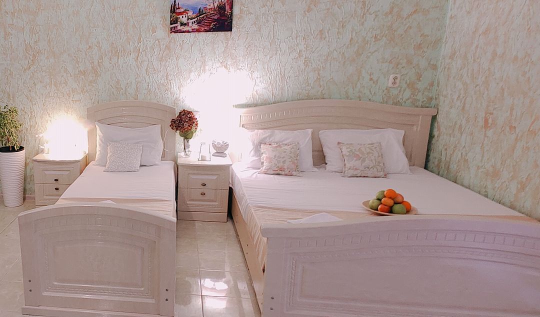 Номер оборудован: двуспальная кровать, односпальная кровать, прикроватные тумбочки, зеркало, шкаф, туалетный столик, мини-холодильник, телевизор, кондиционер